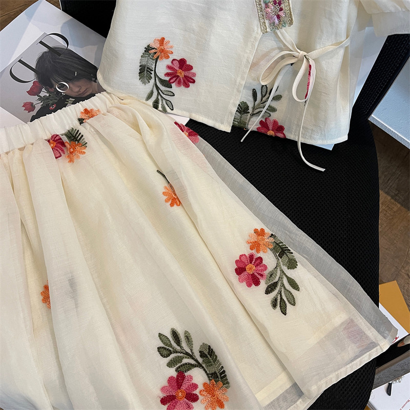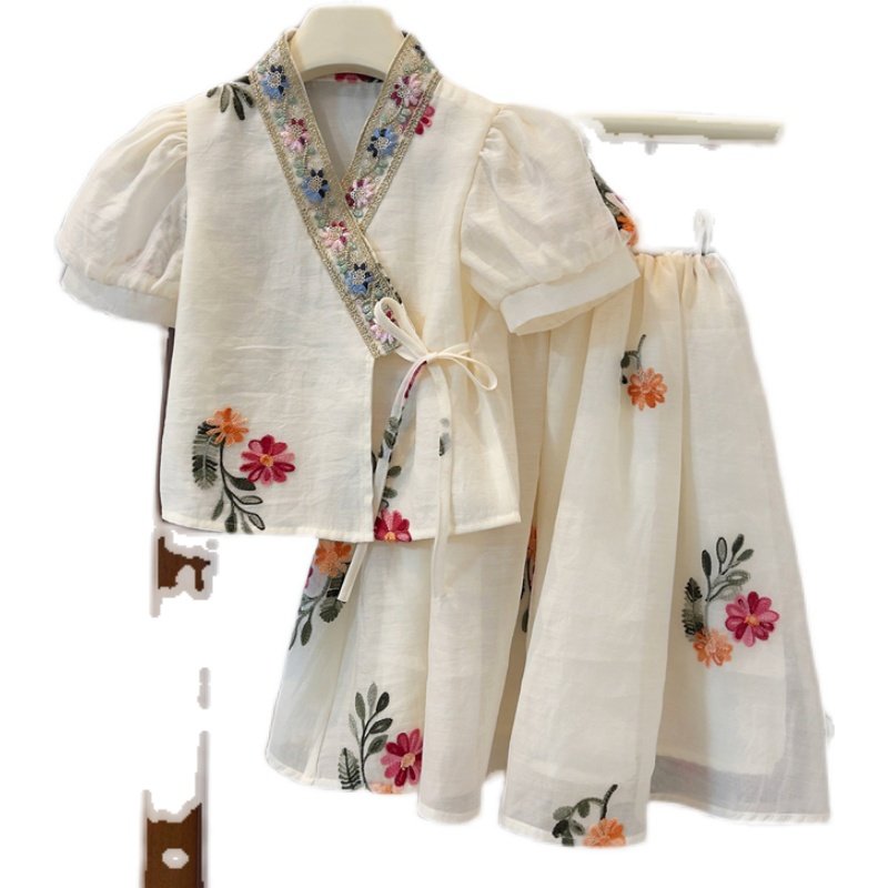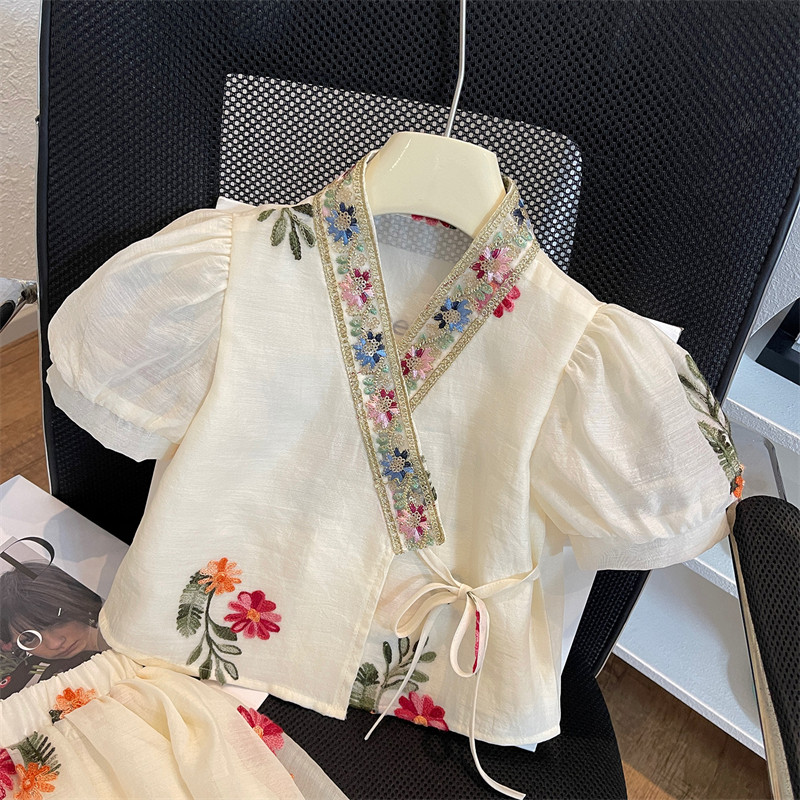 2023夏季新款洋气套装女童蕾丝刺绣名族风网纱上衣+长裙两件套潮