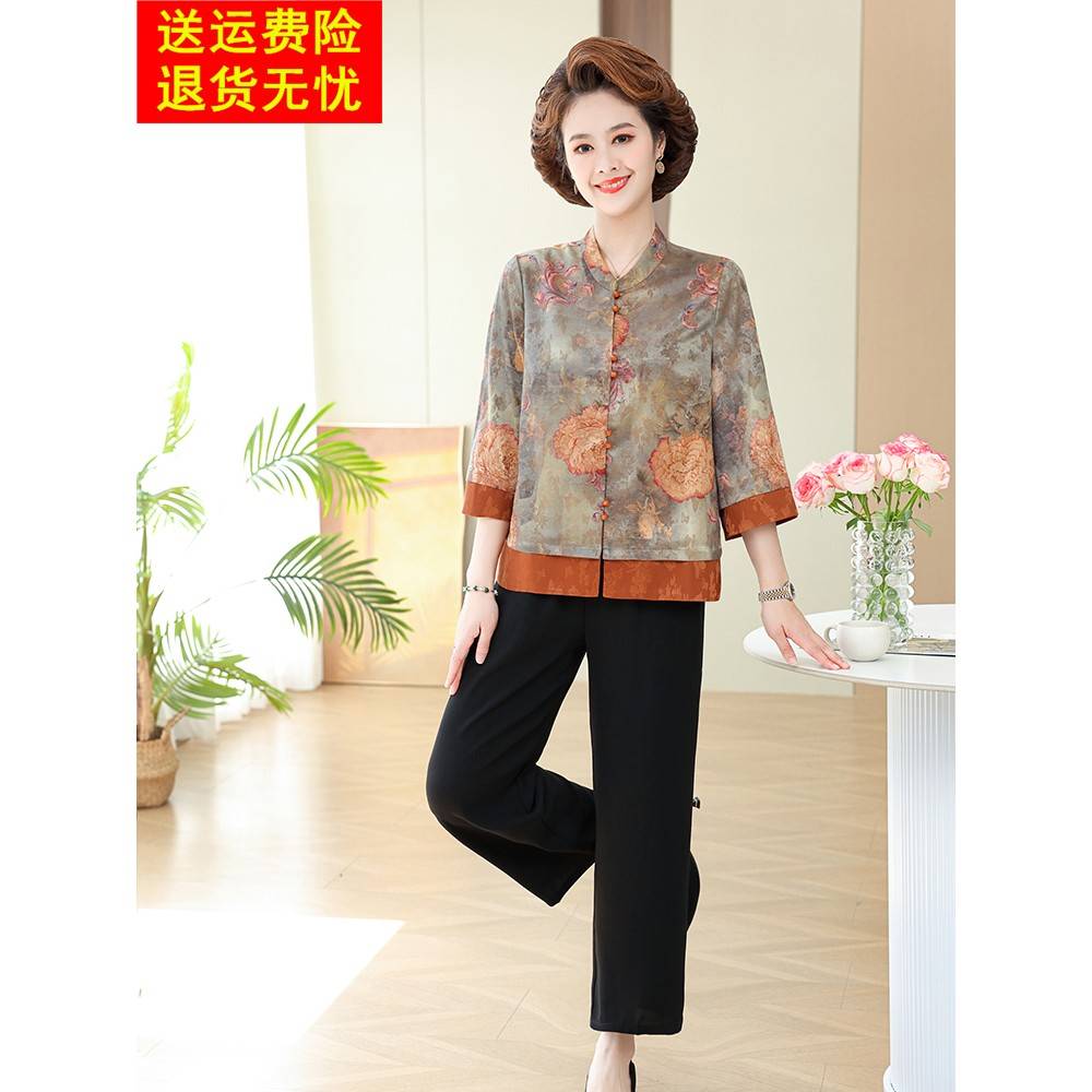 中老年人女装中国风真丝衬衫女妈妈夏装真丝上衣大码中式衬衣套装