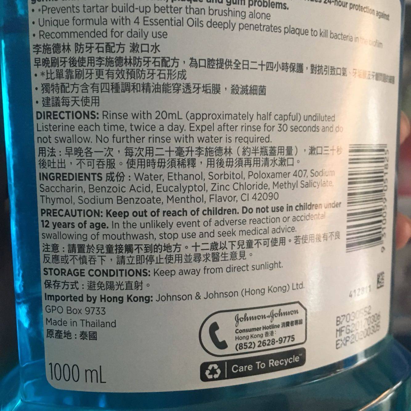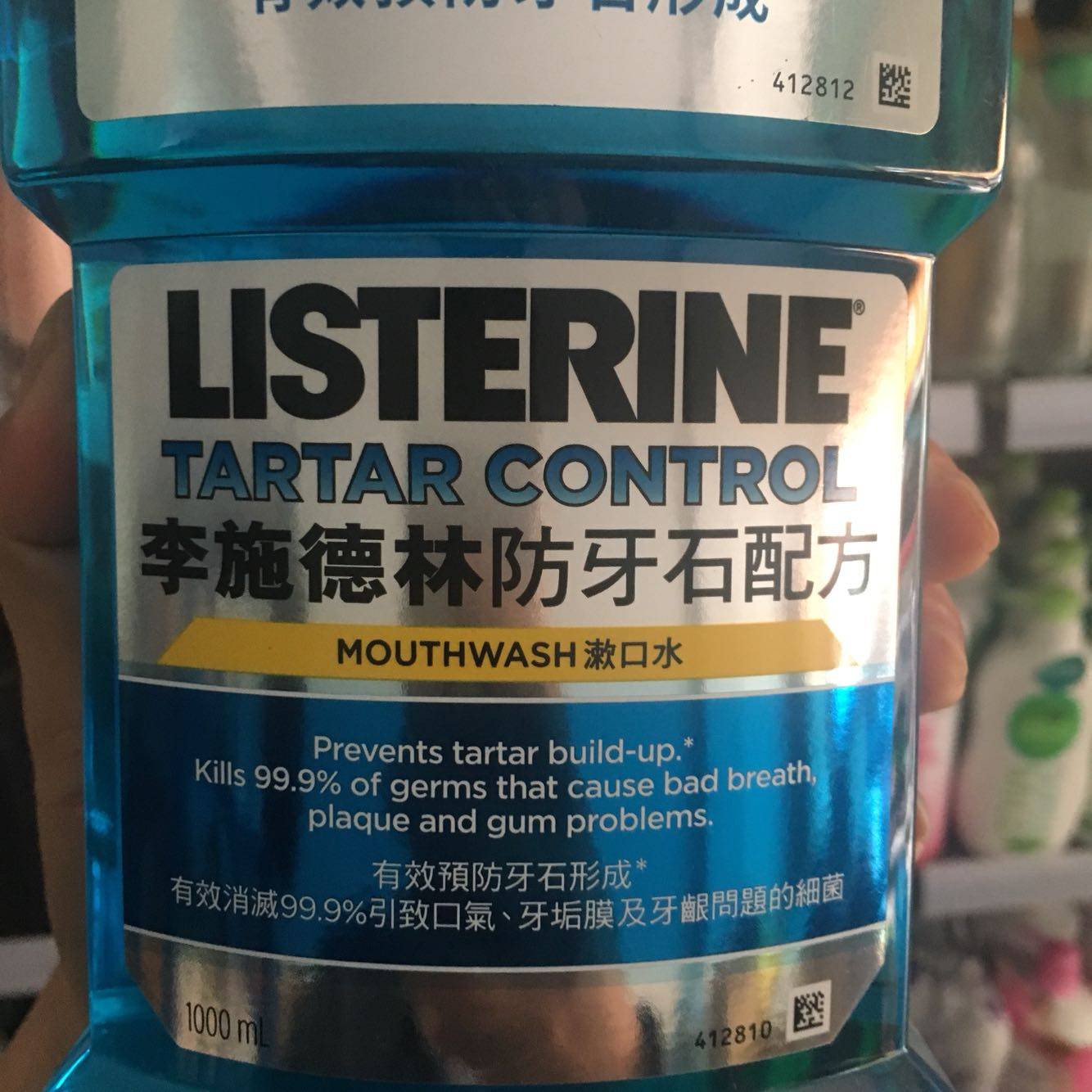 香港进口 李施德林漱口水1000ml防牙石配方 冰蓝牙龈护理包邮