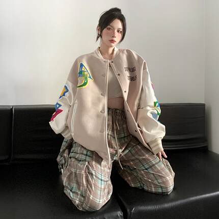 DUSK美式植绒毛巾绣拼色棒球服女春秋季潮牌宽松情侣百搭夹克外套