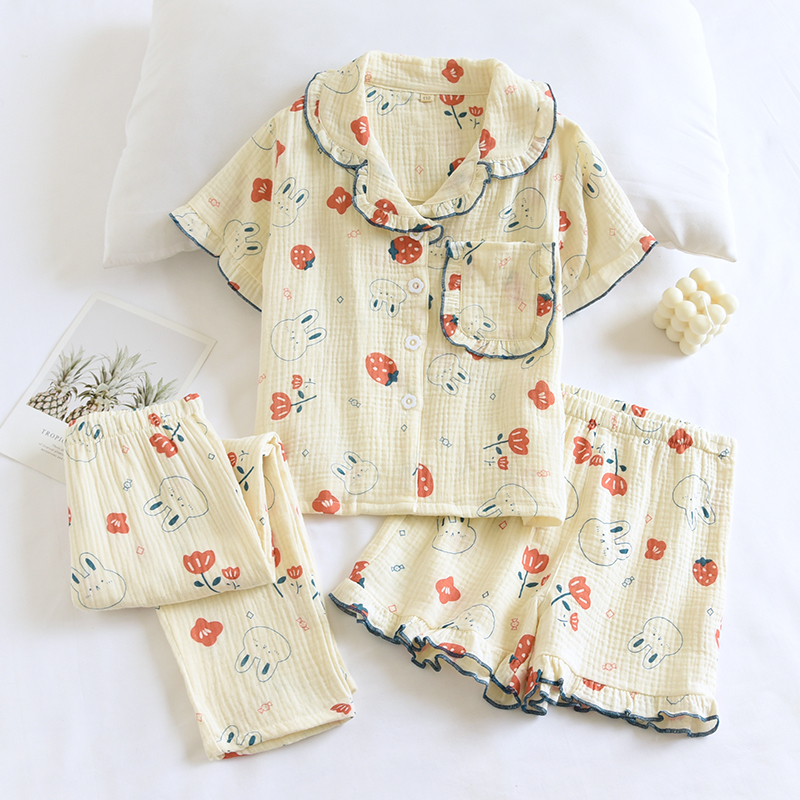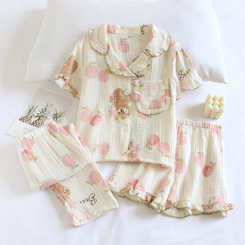 儿童夏季薄款纯棉纱布睡衣套三件套小清新亲子短袖长裤短裤家居服