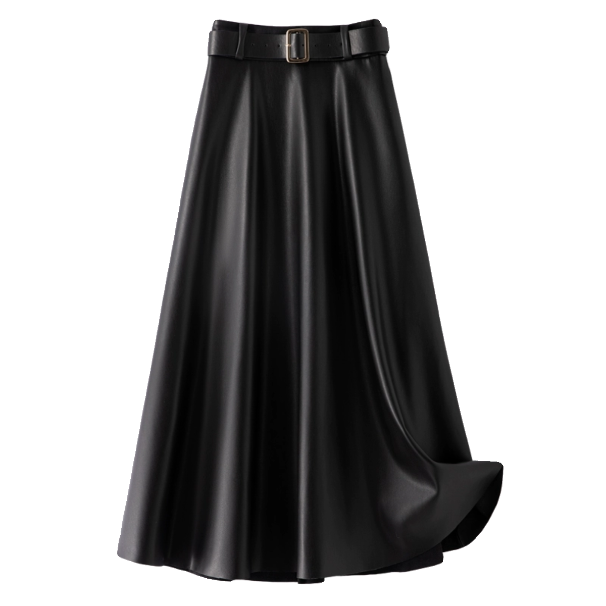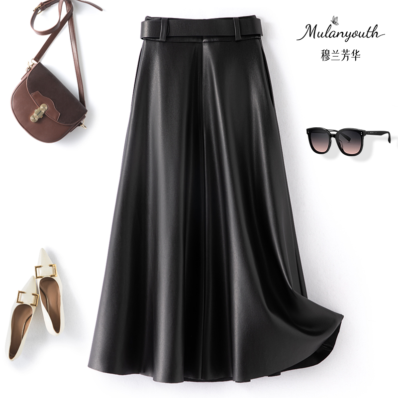 秋冬季黑色皮裙半身裙女中长款显瘦遮胯高腰A字裙简约伞裙送腰带