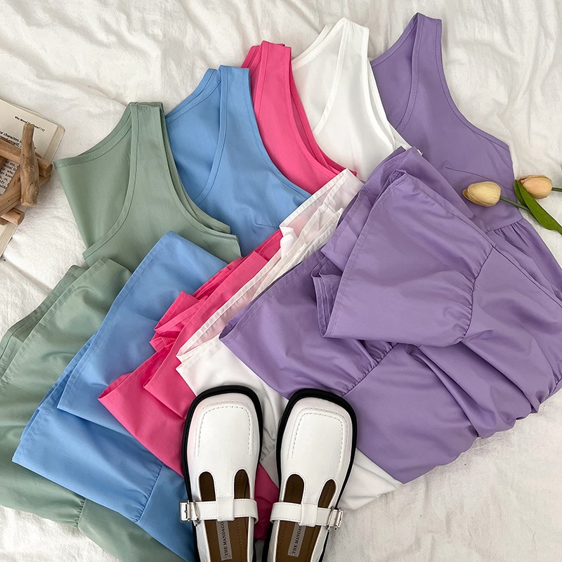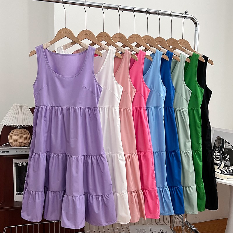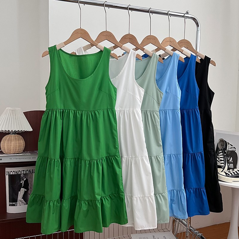 甜美百搭圆领无袖背心裙拼接中长款连衣裙蛋糕裙女2025夏季新款
