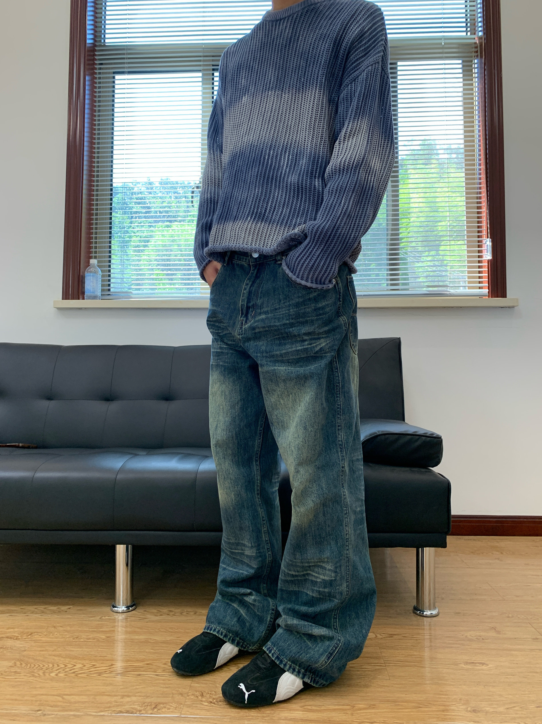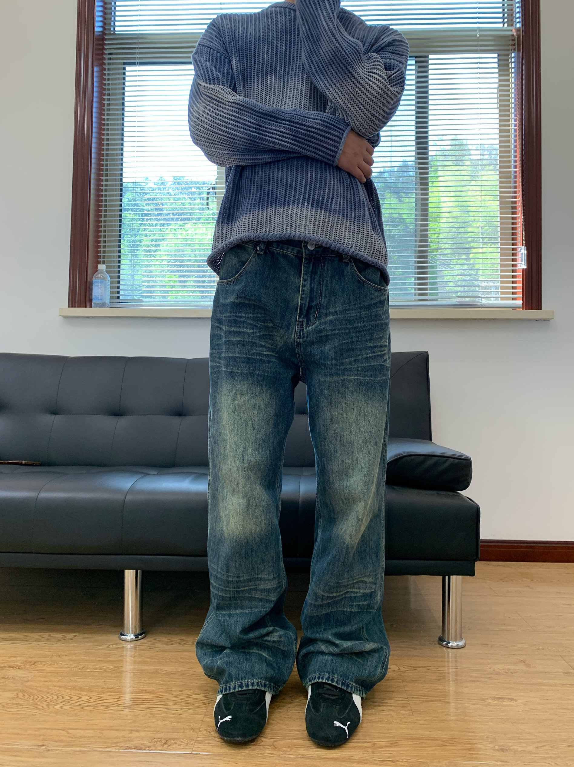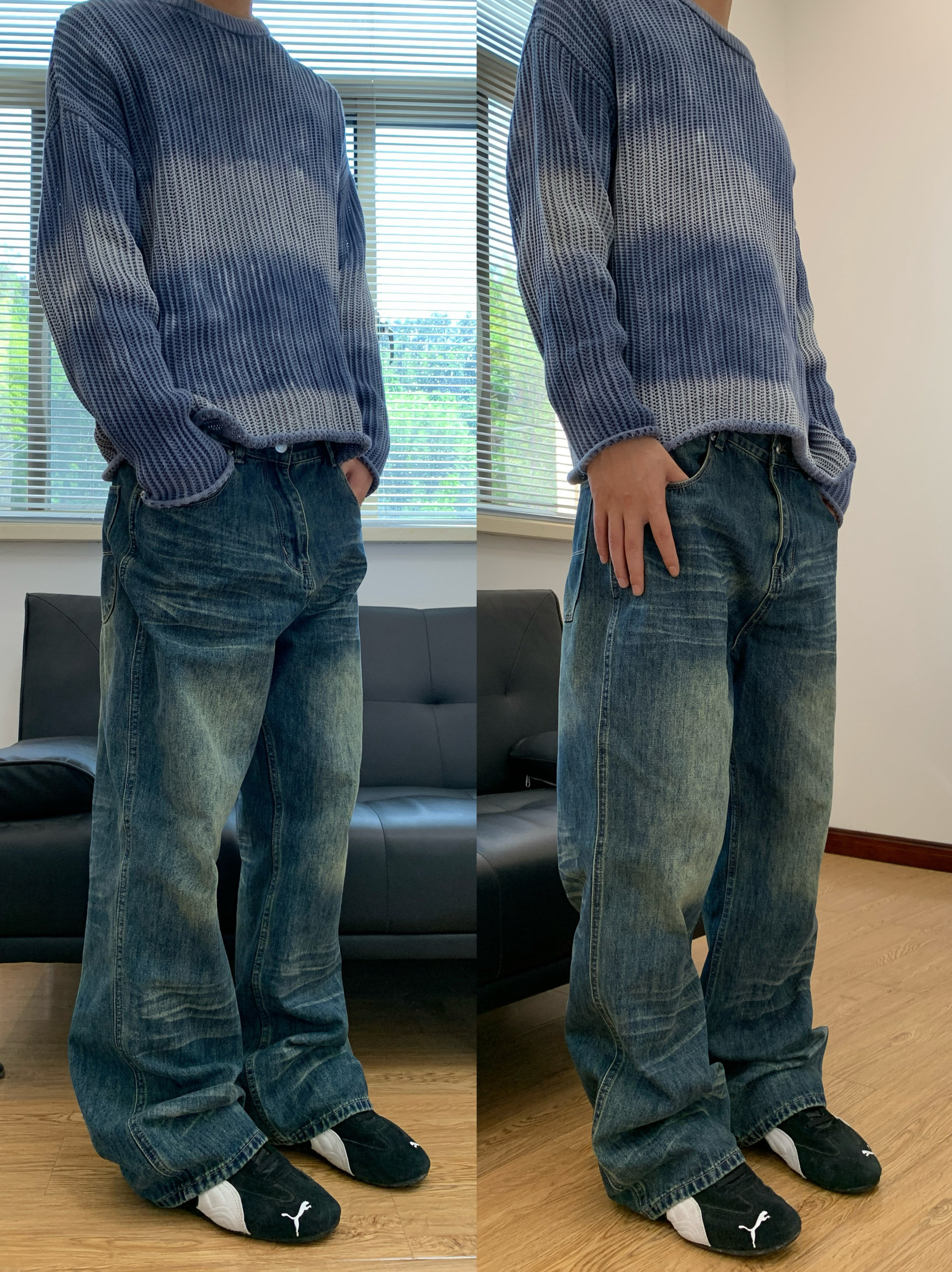 07QWER 夏季水洗猫须复古潮拖地牛仔裤男女薄款深蓝青春流行宽松
