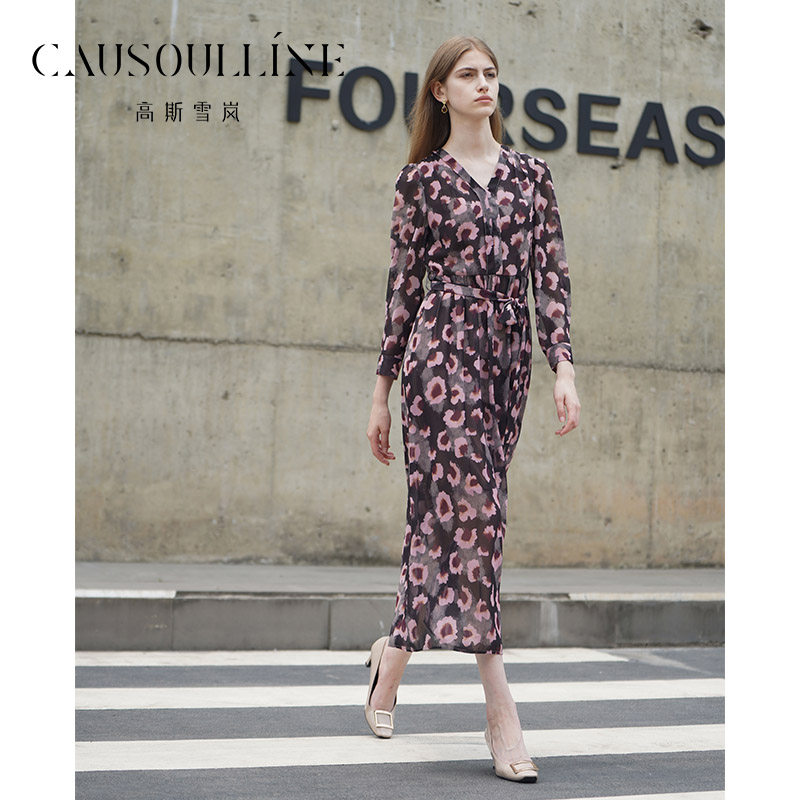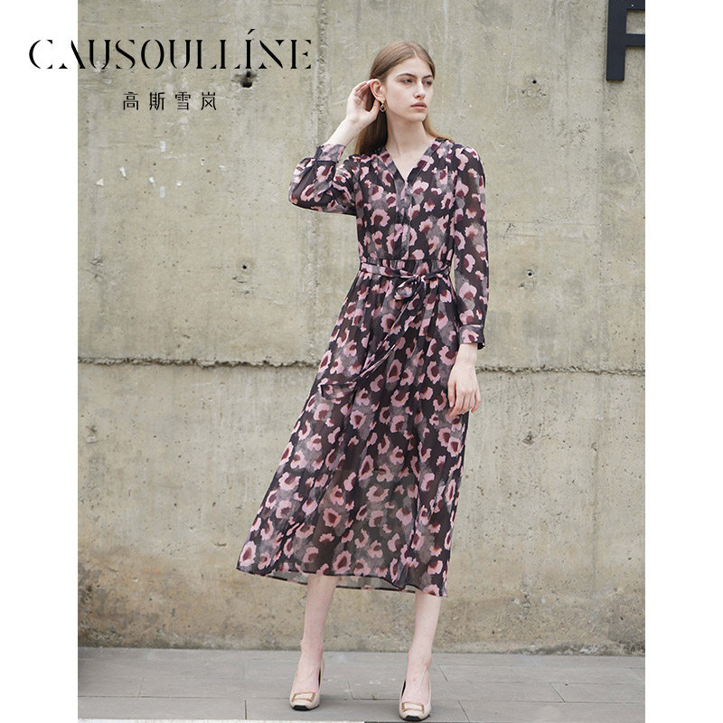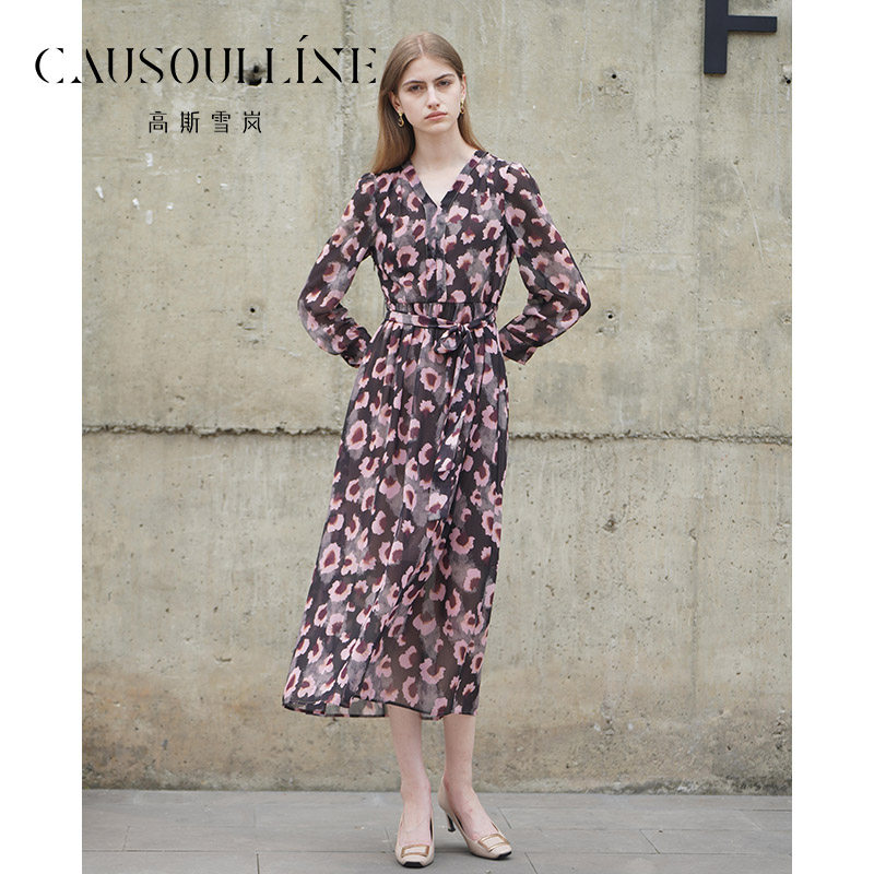 高斯雪岚2024秋装新款高级感印花连衣裙V领碎花显瘦度假风长裙女