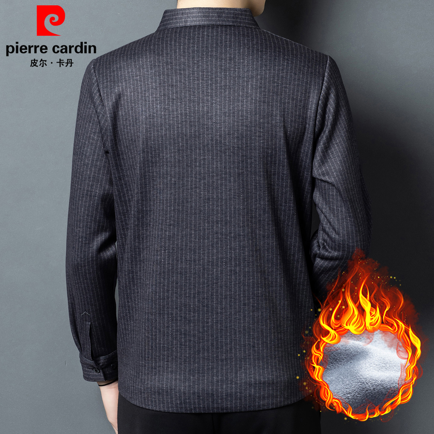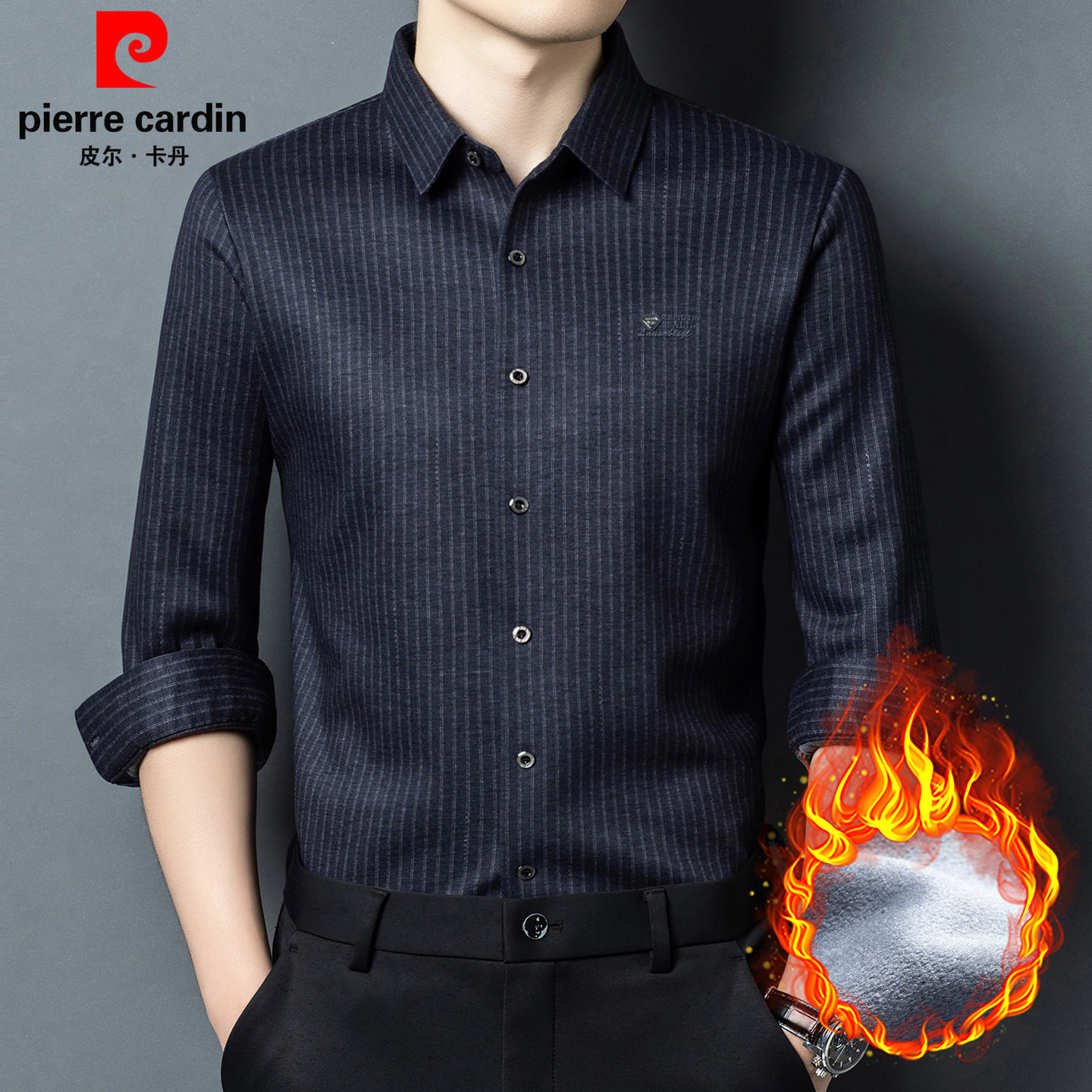 皮尔卡丹冬季条纹羊毛衬衫长袖男士中年加绒加厚休闲免烫保暖衬衣