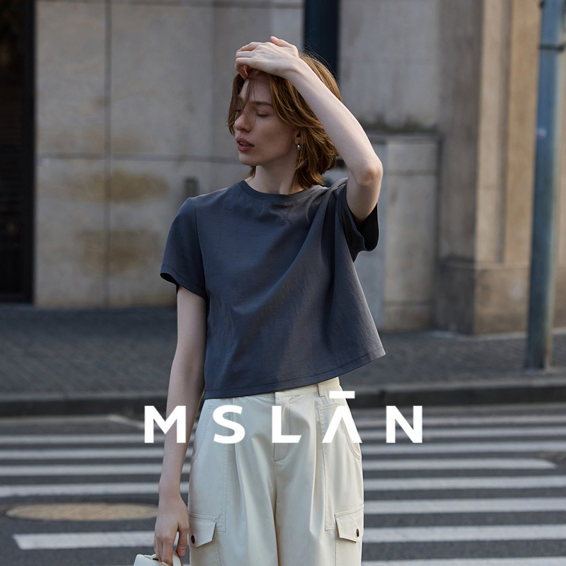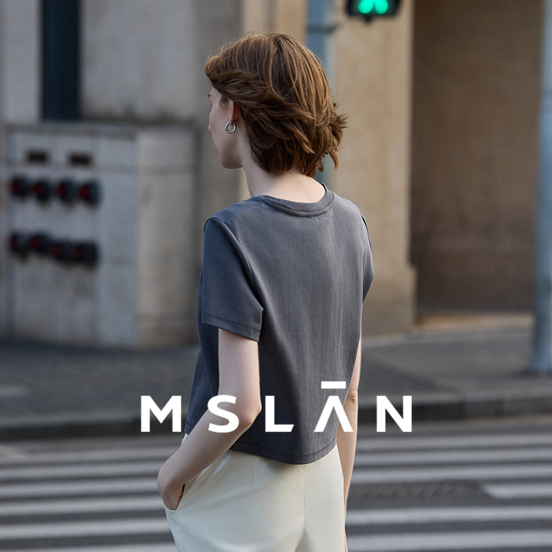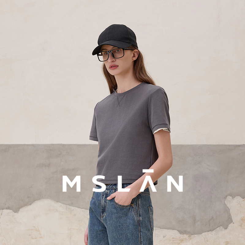 时髦正肩T/ MSLAN灰色圆领撞色短款T恤休闲短袖上衣女MGBN449