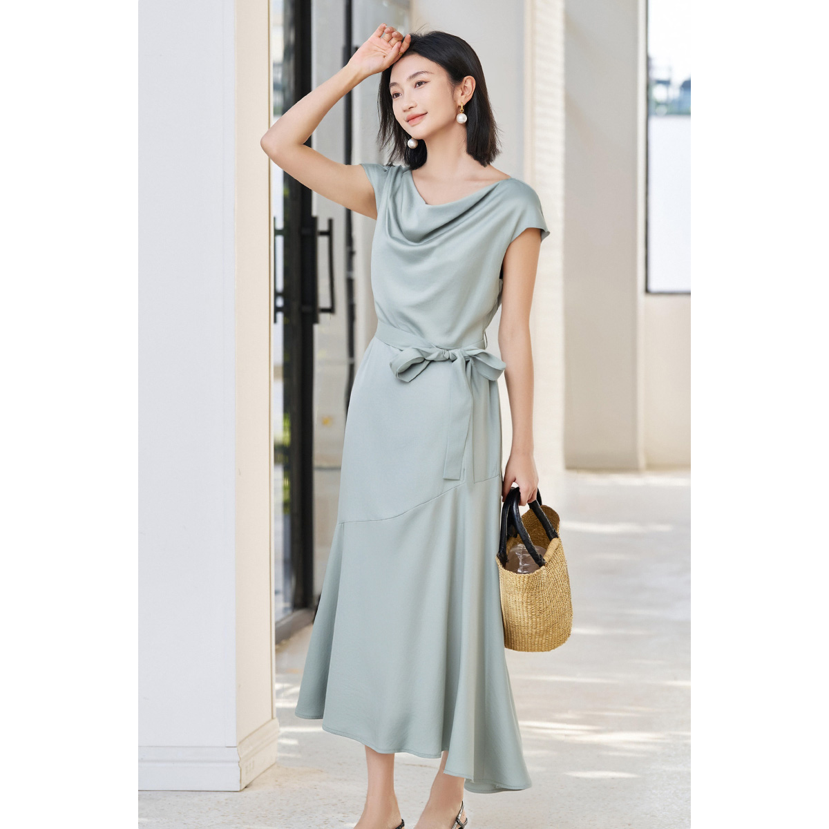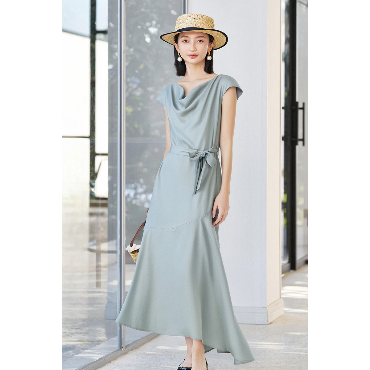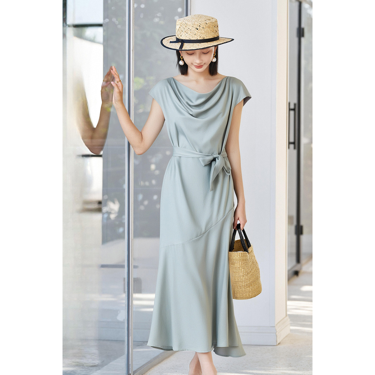 米思阳2025夏季新款气质优雅100%莱赛尔连衣裙设计感荡领长款裙子