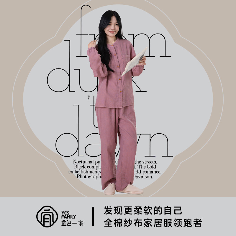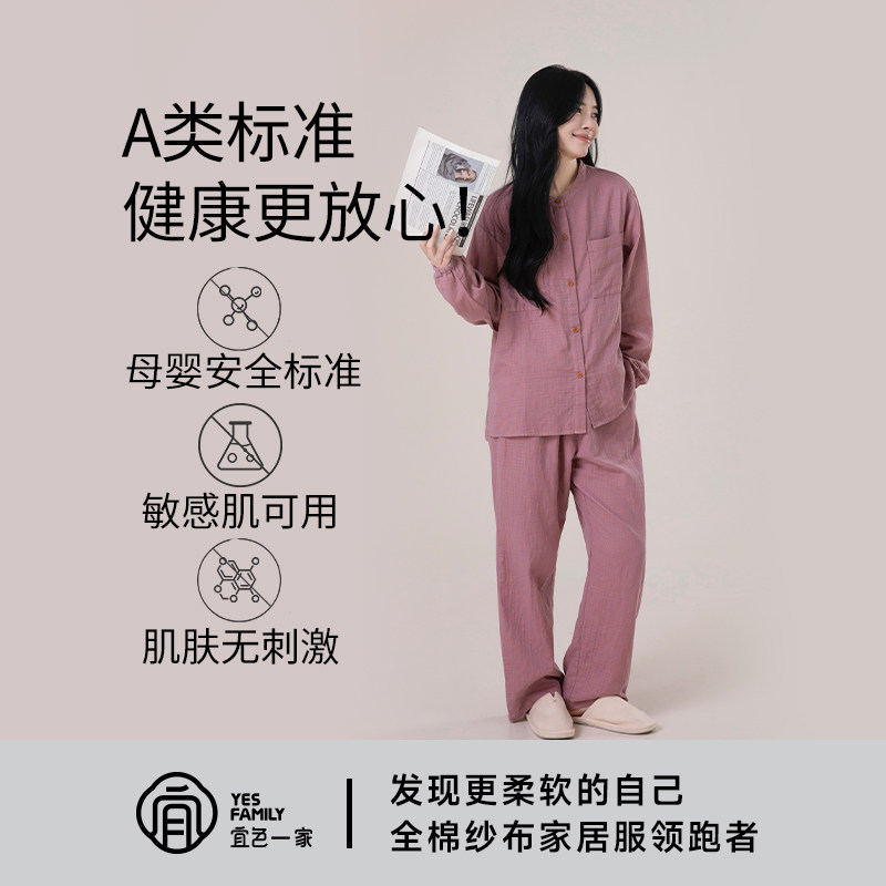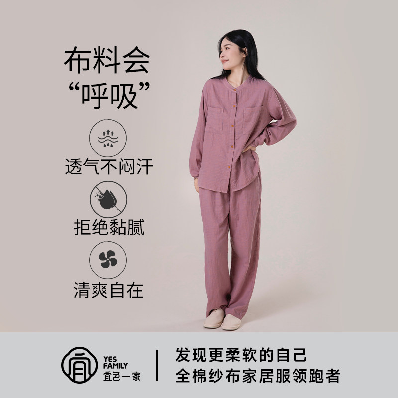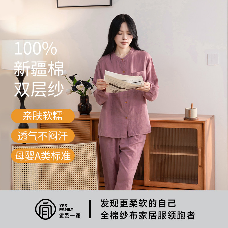 宜色家睡衣女A类全棉双层纱布衣亲肤透气吸汗外穿情侣家居服套装