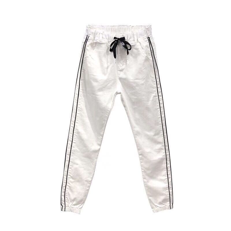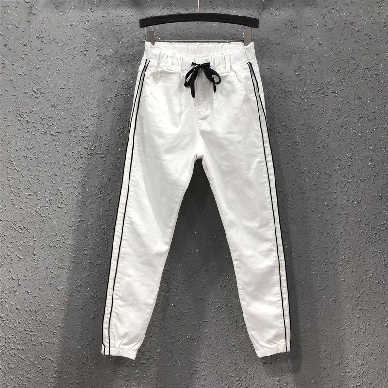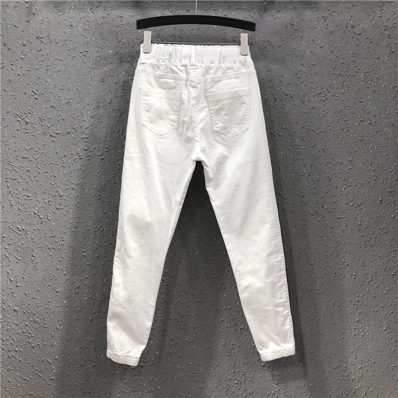 【高含棉】欧洲站白色休闲牛仔束脚裤子大码松紧腰宽松哈伦裤女潮