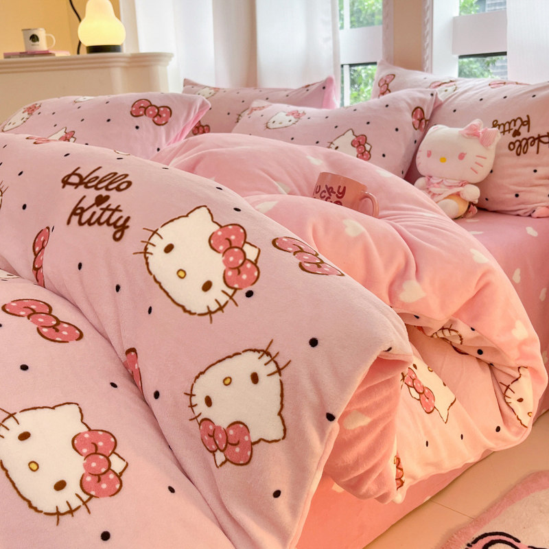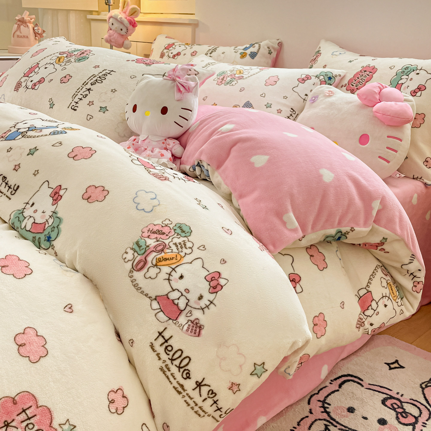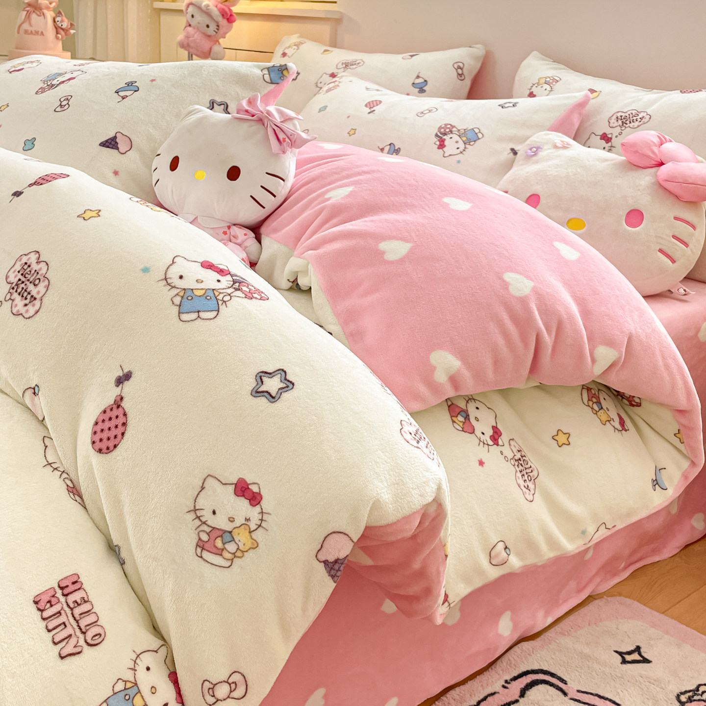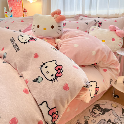 冬季牛奶绒被套单件加绒儿童被罩hellokitty双面法兰珊瑚绒四件套