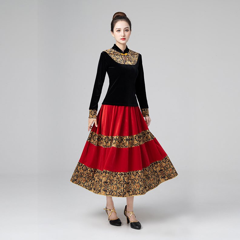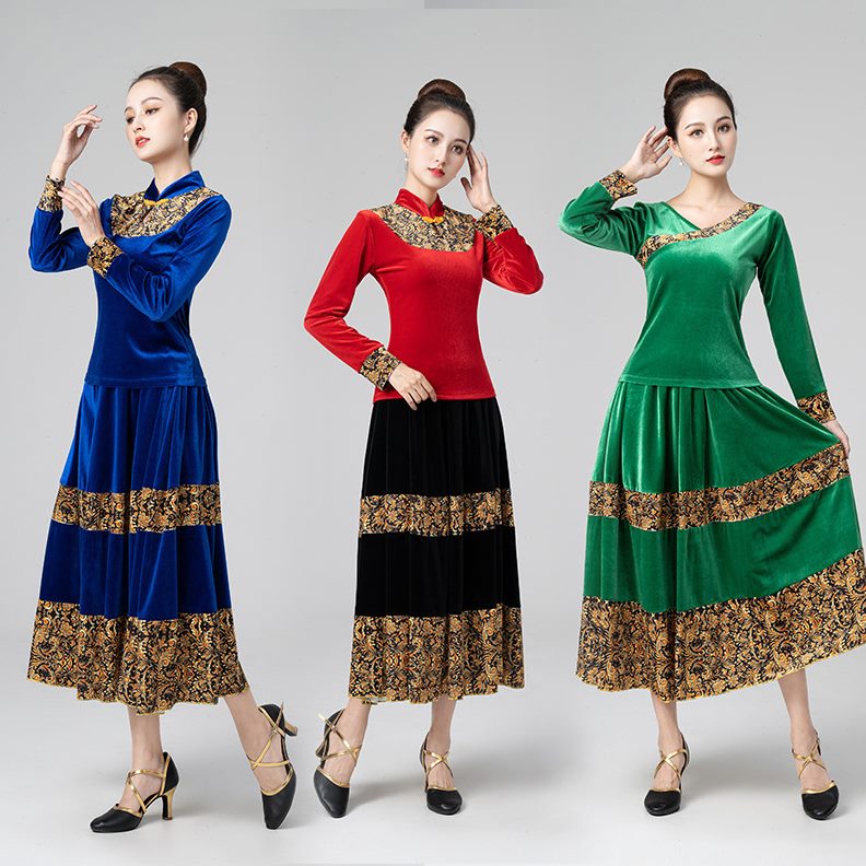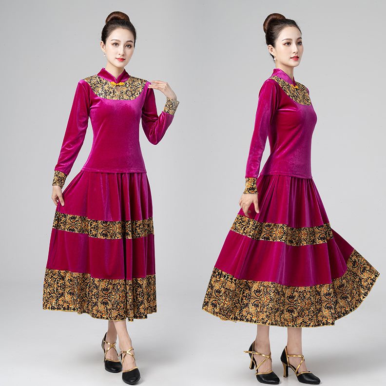 民族金丝舞舞蹈长袖秋冬绒演出服跳大摆裙古典新款套装广场舞服装