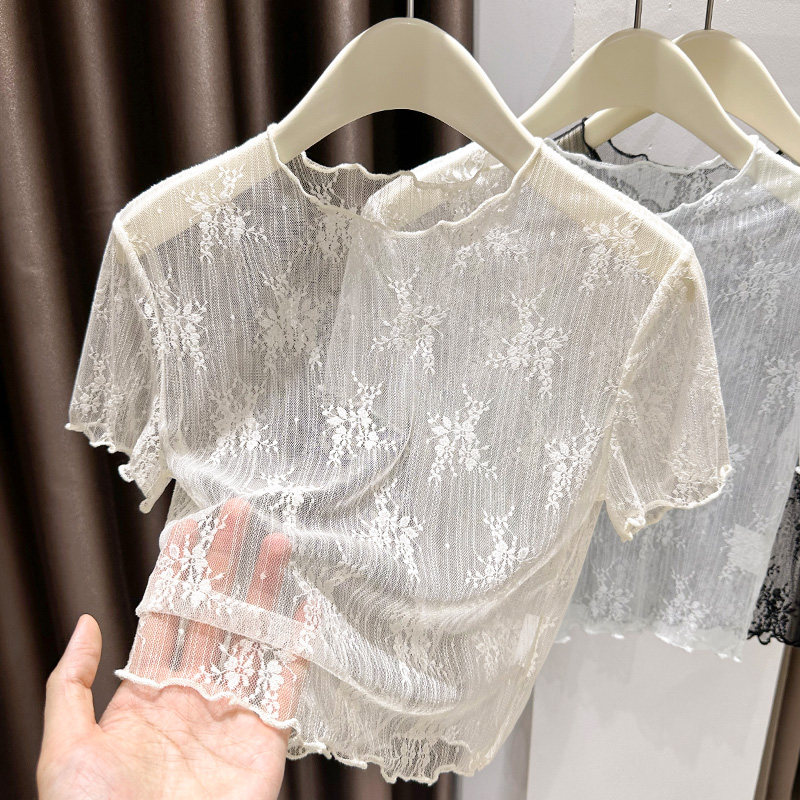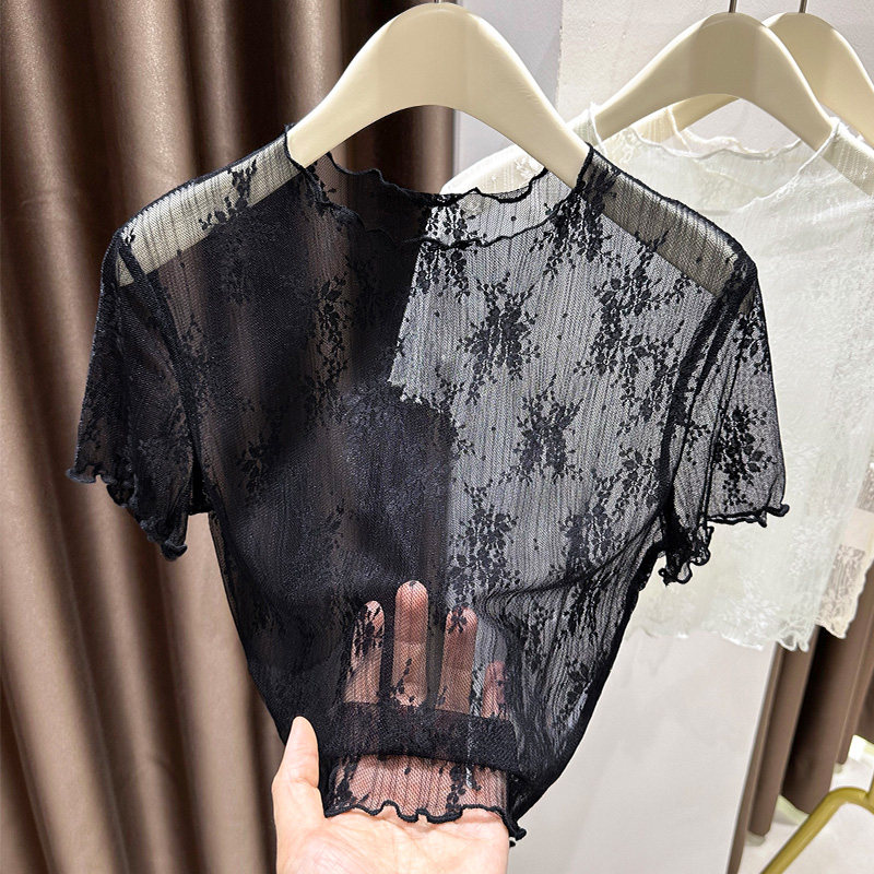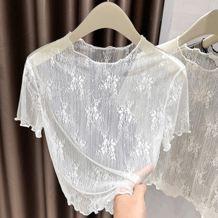 白色短款木耳边蕾丝T恤女夏季透视薄纱短袖打底衫高级感半截上衣