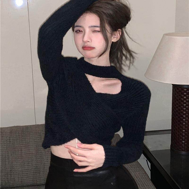 港味风格水貂绒挂脖v领针织毛衣女秋冬长袖T恤交叉短款打底上衣潮