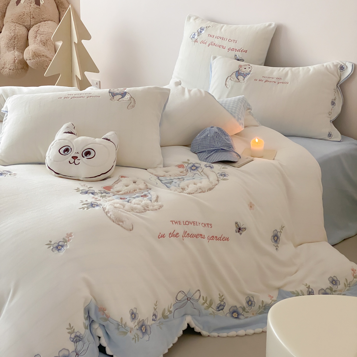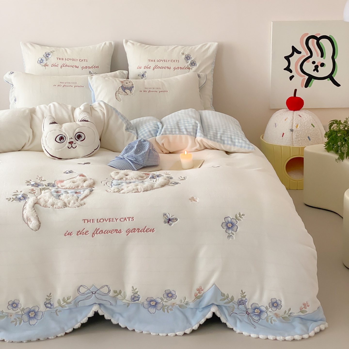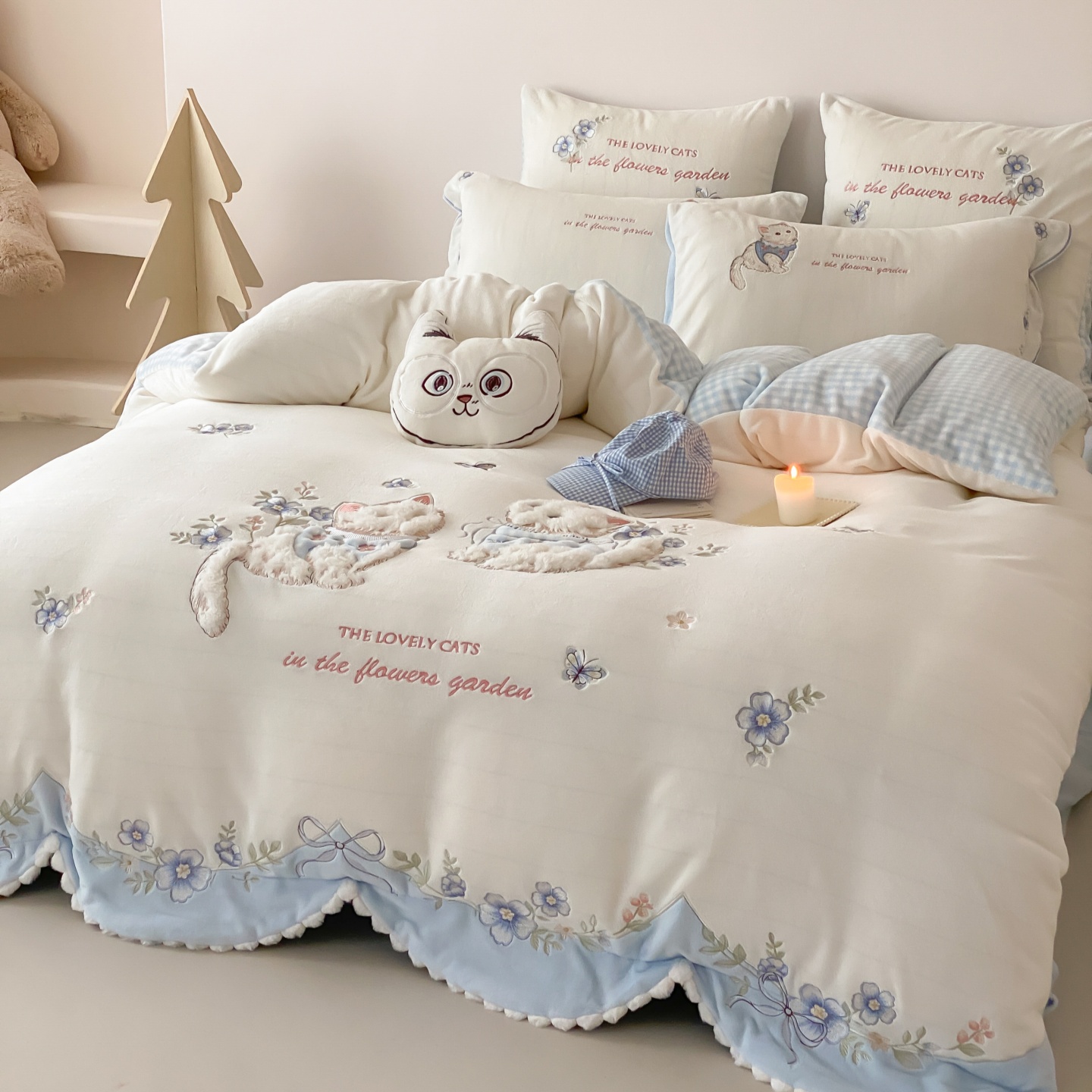 冬季少女心可爱猫咪卡通加厚牛奶绒四件套儿童珊瑚绒被套床单床品