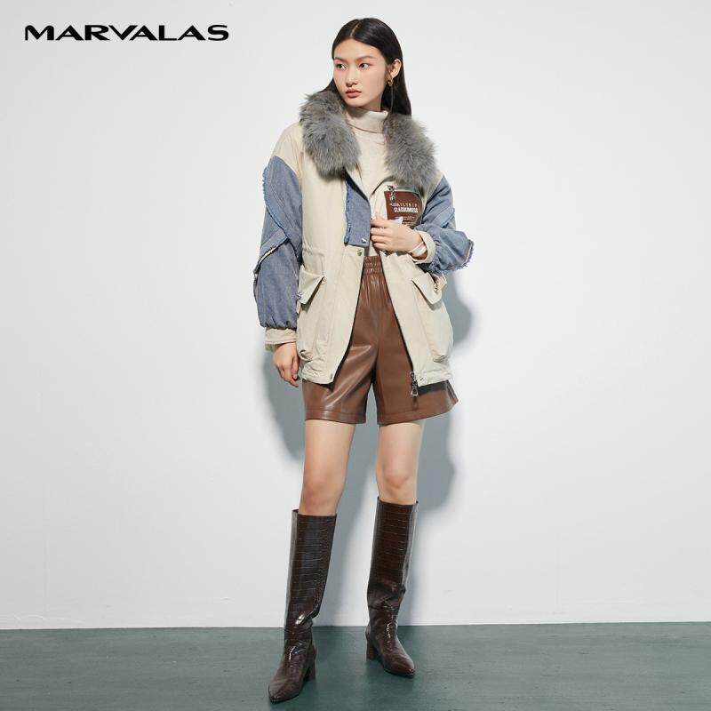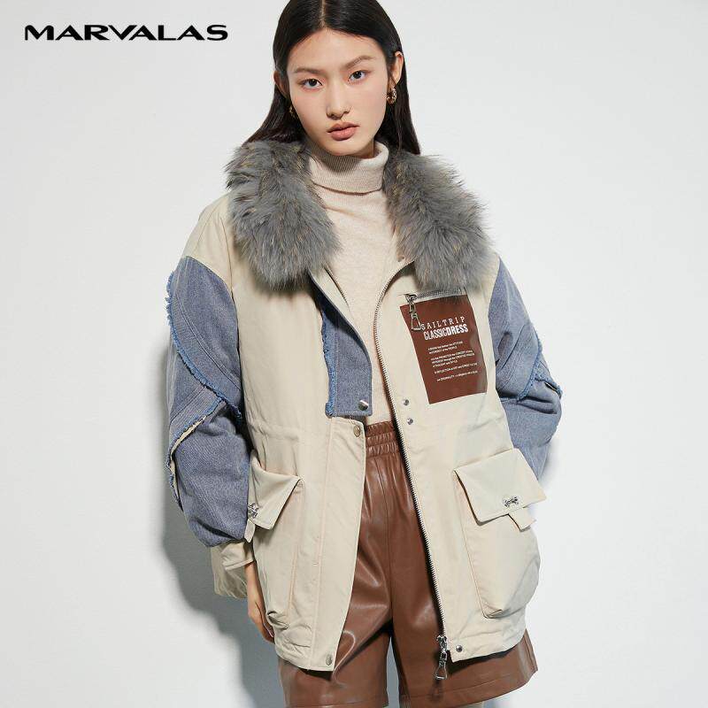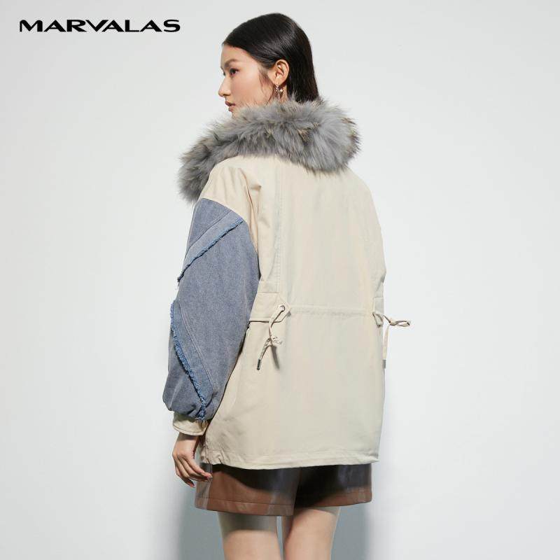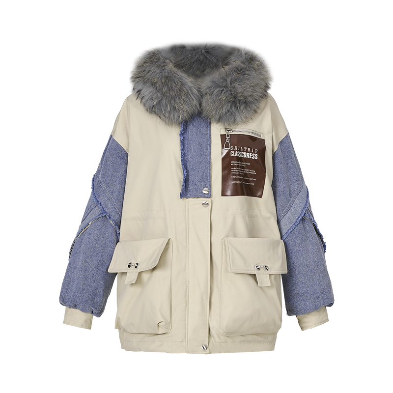 曼德诗牛仔拼接毛领羽绒服