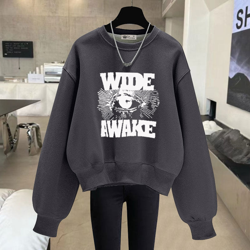 2025春秋冬季韩版趣味印花加绒加厚宽松套头长袖短款圆领卫衣女潮