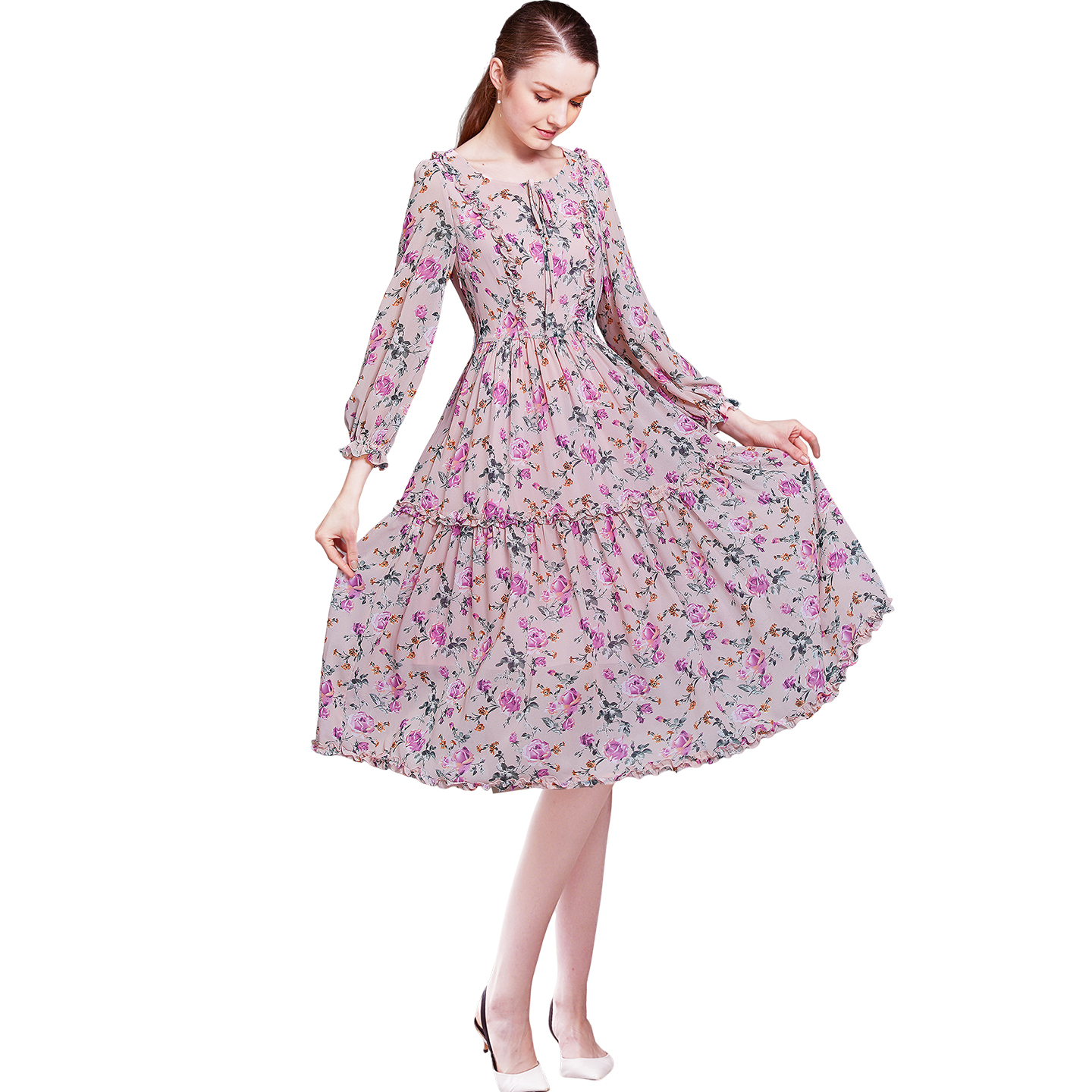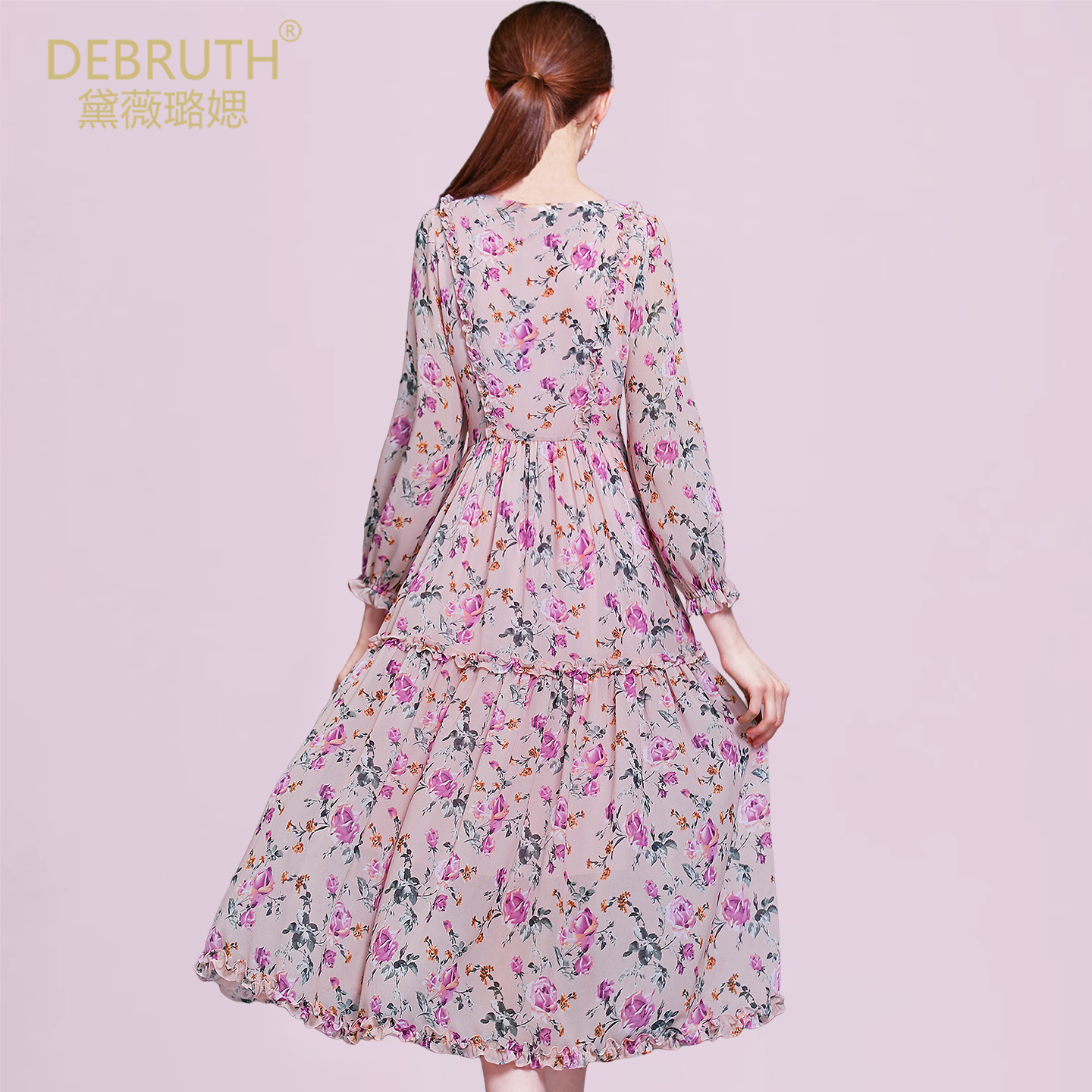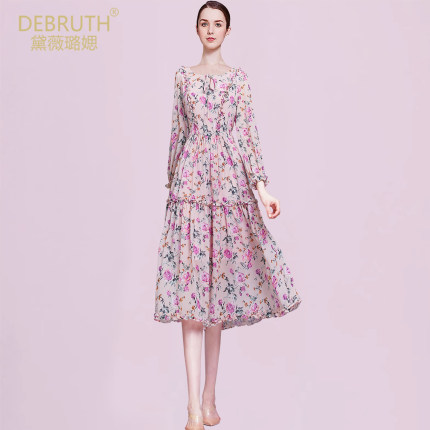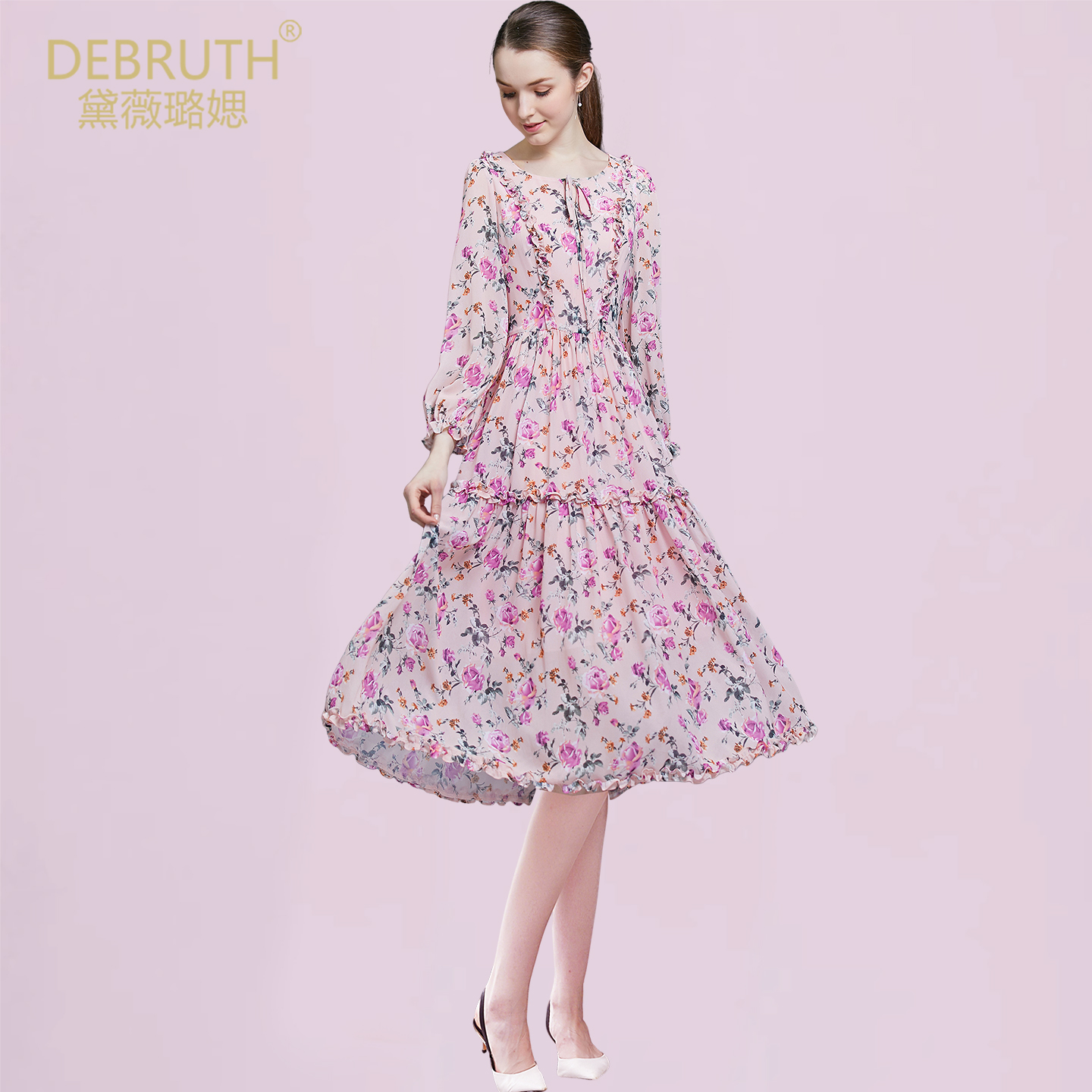 黛薇璐媤灯笼袖印花雪纺连衣裙秋