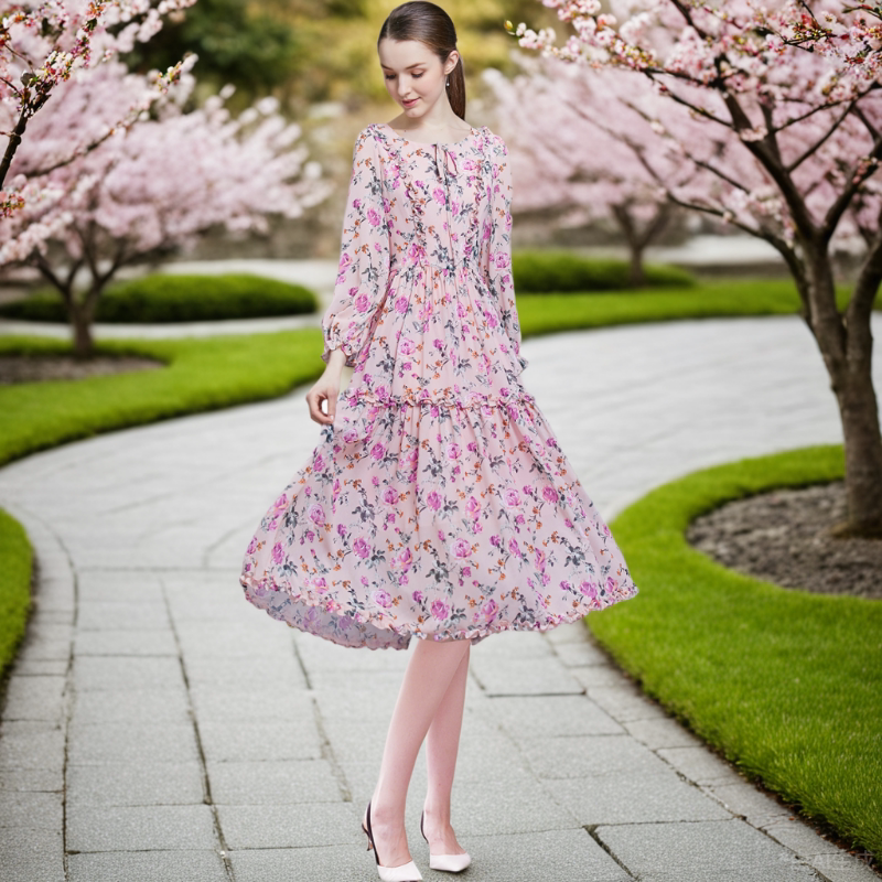 黛薇璐媤灯笼长袖印花雪纺公主连衣裙女2025秋新款气质收腰蛋糕裙