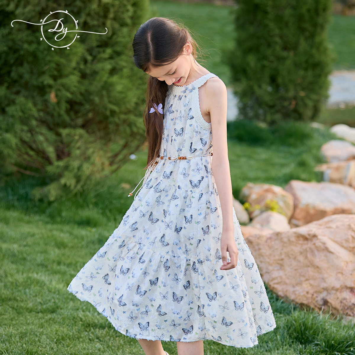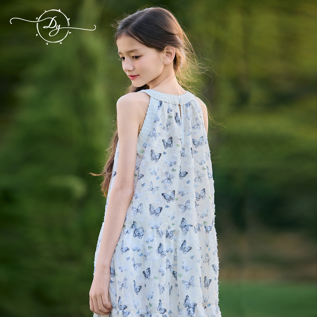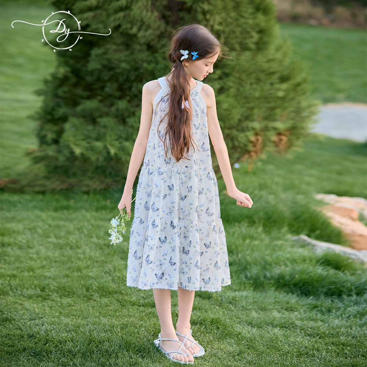 女童连衣裙大童碎花挂脖长裙蝴蝶结2025夏季新款法式气质公主裙子