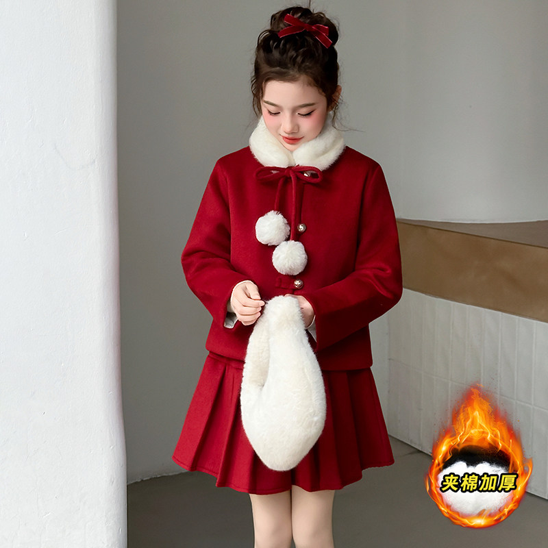 女童超好看红色年服套装冬季2025新款大童冬装加厚呢子外套半身裙