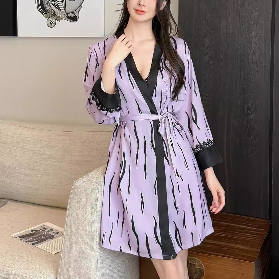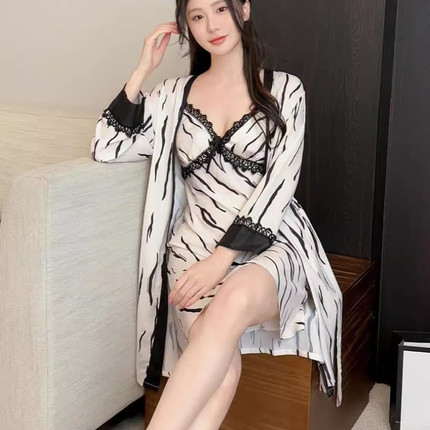 桑蚕丝韩版斑马纹带胸垫睡裙睡袍