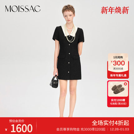 商场同款 摩萨克2025秋新款翻领X型小香风粗花呢撞色收腰连衣裙女