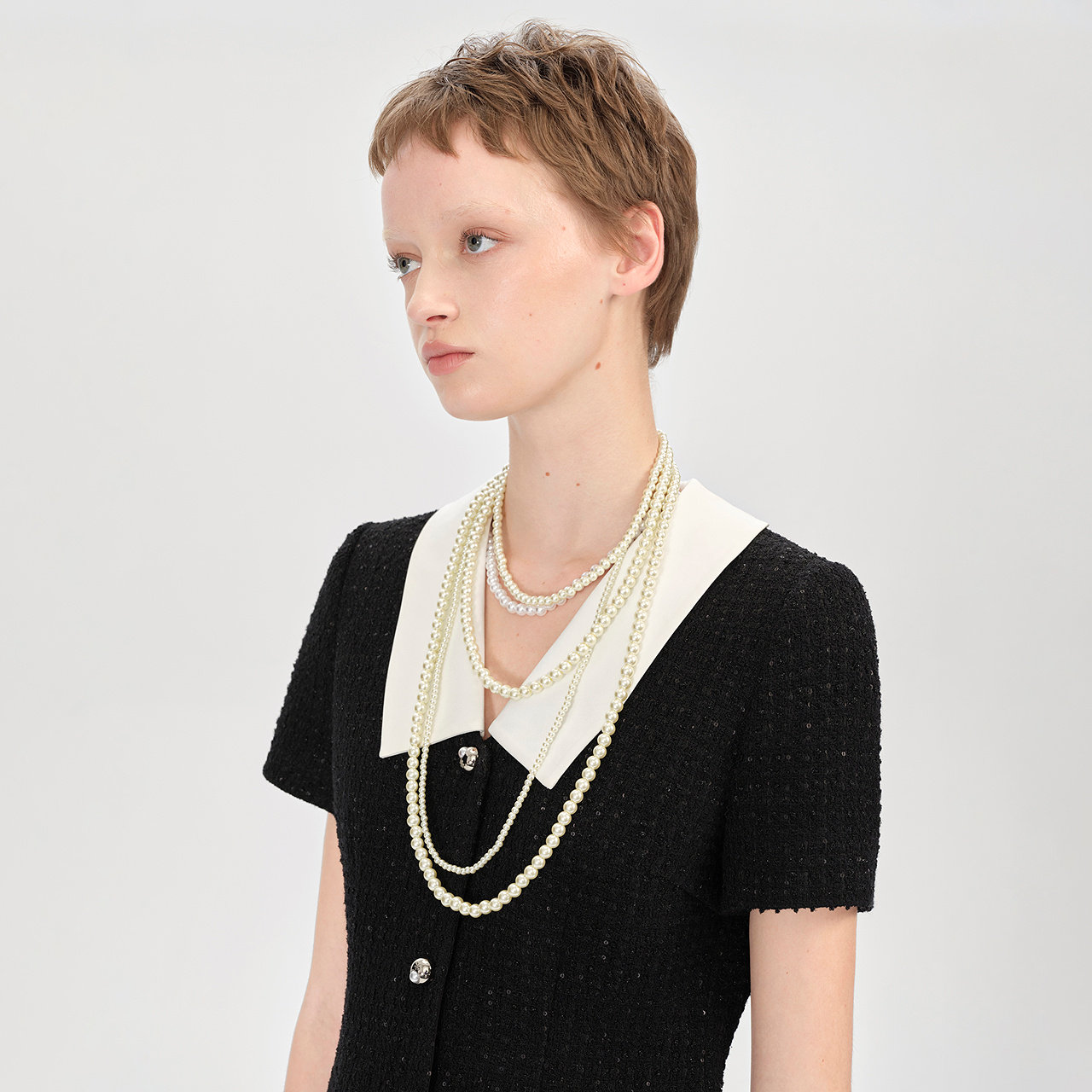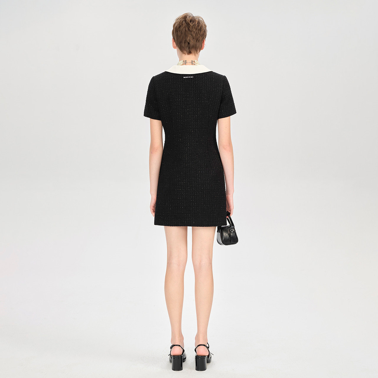 摩萨克小香风粗花呢翻领连衣裙