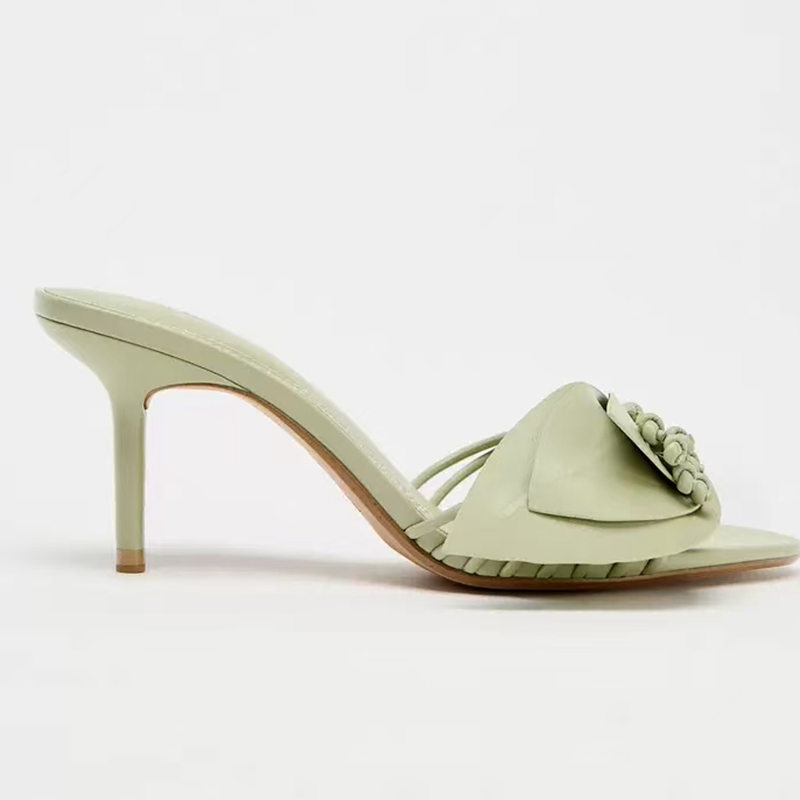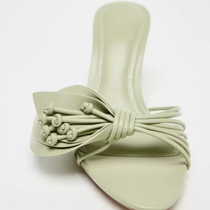 西班牙2025夏季新款一字带后空女拖鞋绿色花朵装饰尖头细高跟凉鞋