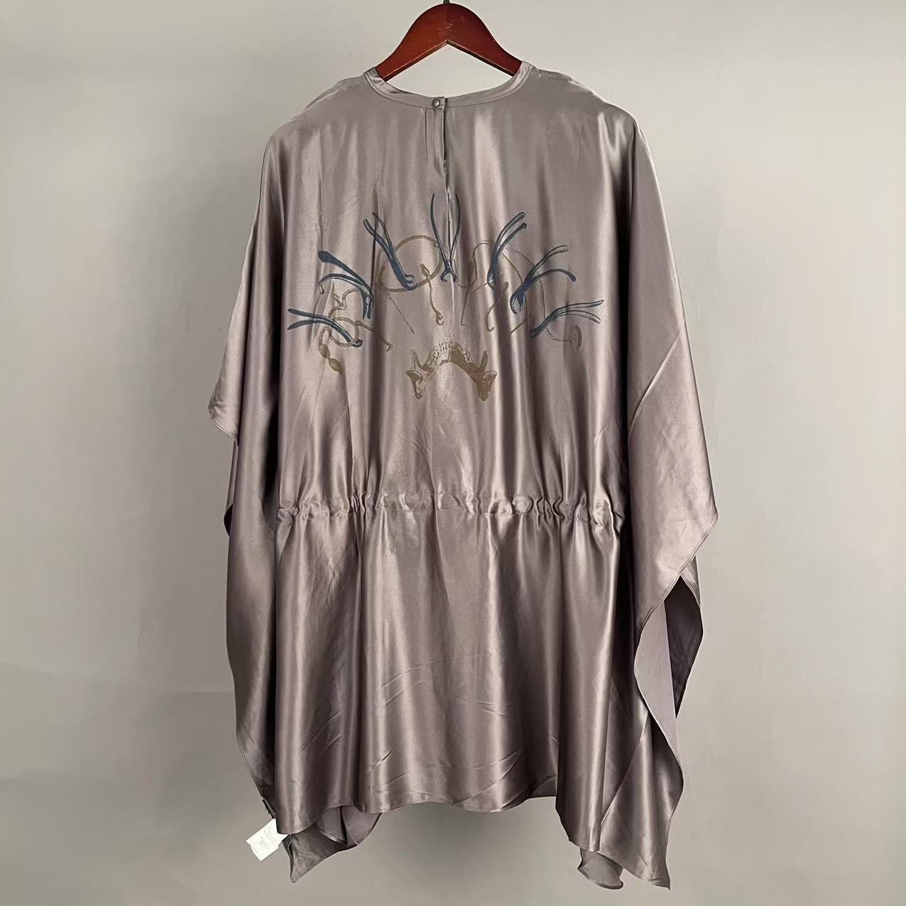 2025夏季新款桑蚕丝蝙蝠式印花抽褶连衣裙A045