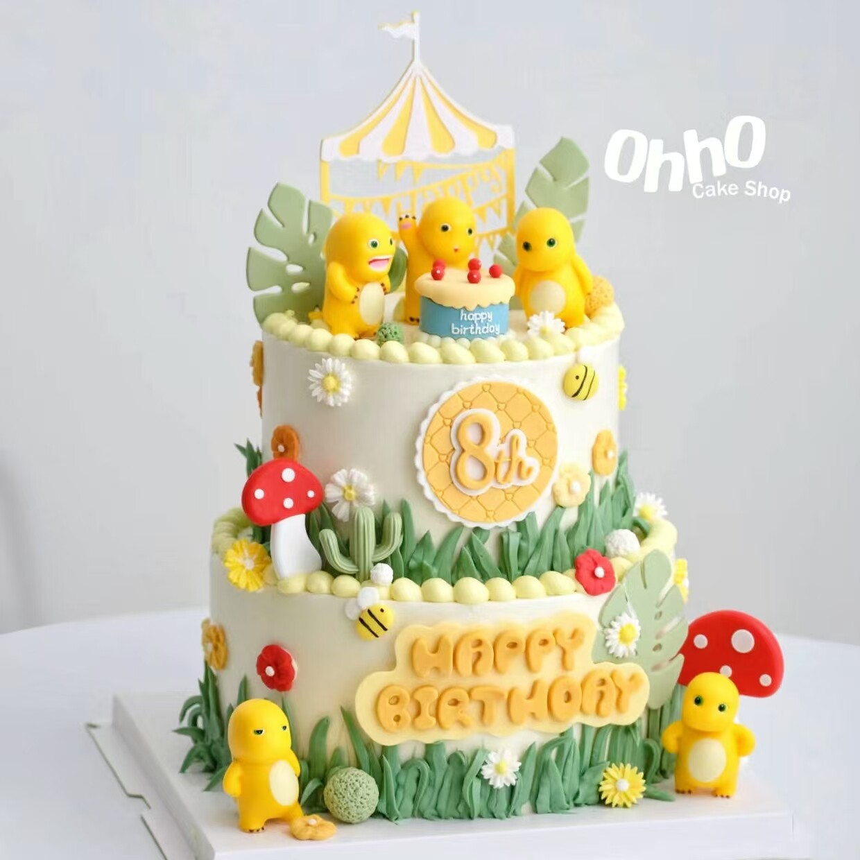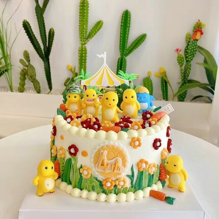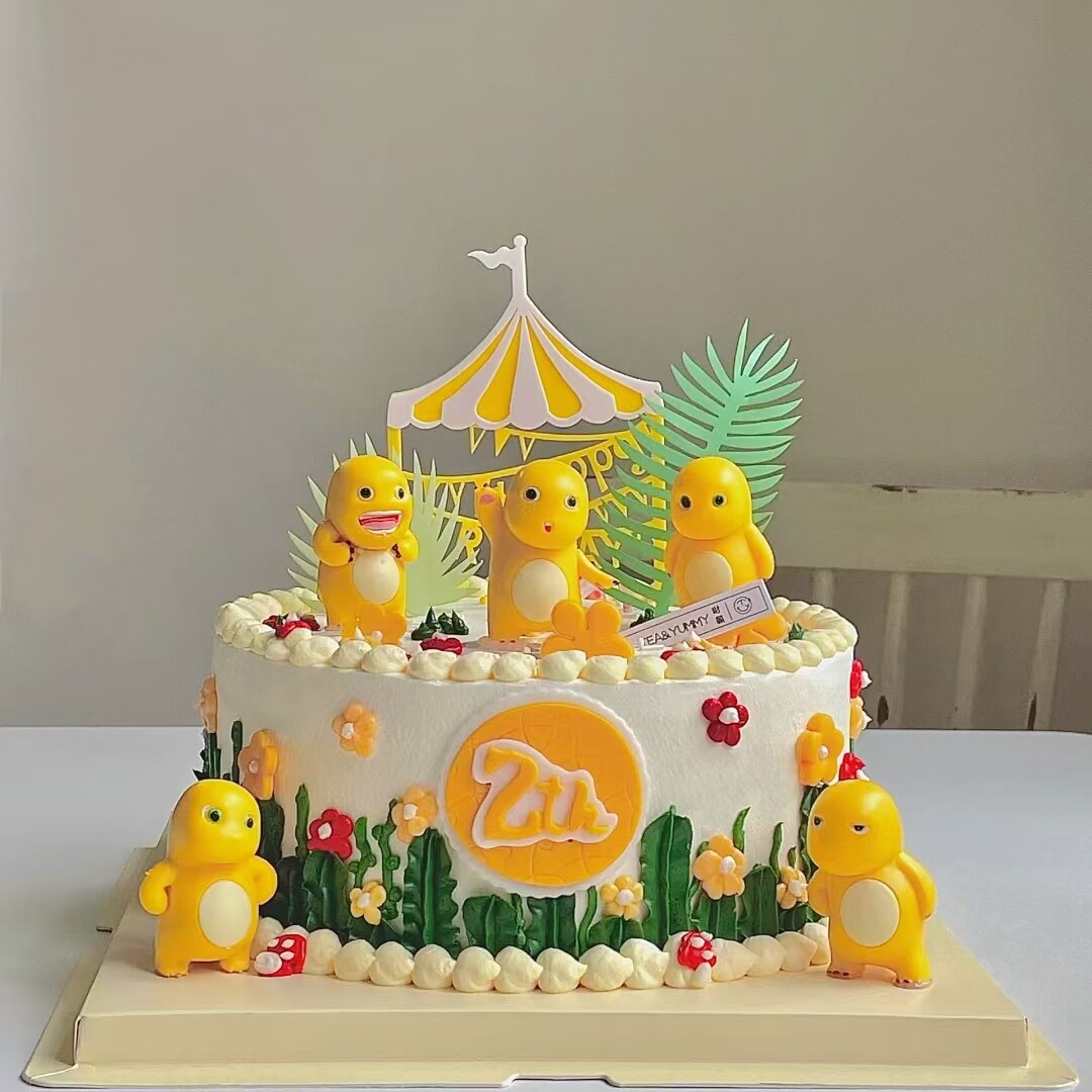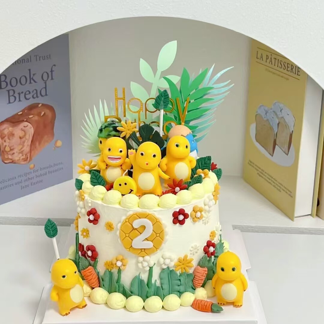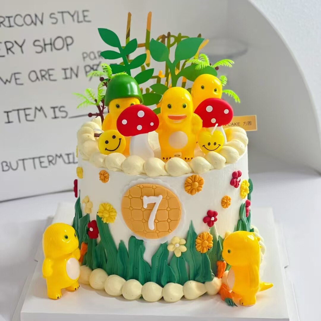 胖胖卡通可爱奶龙生日蛋糕装饰插件森系恐龙蘑菇花朵黄胖胖龙摆件