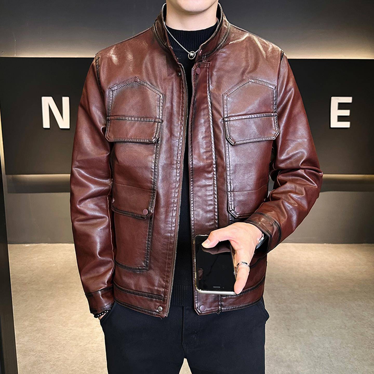秋冬时尚男款优质皮外套修身立领机车夹克衫男士摩托皮衣服1015z