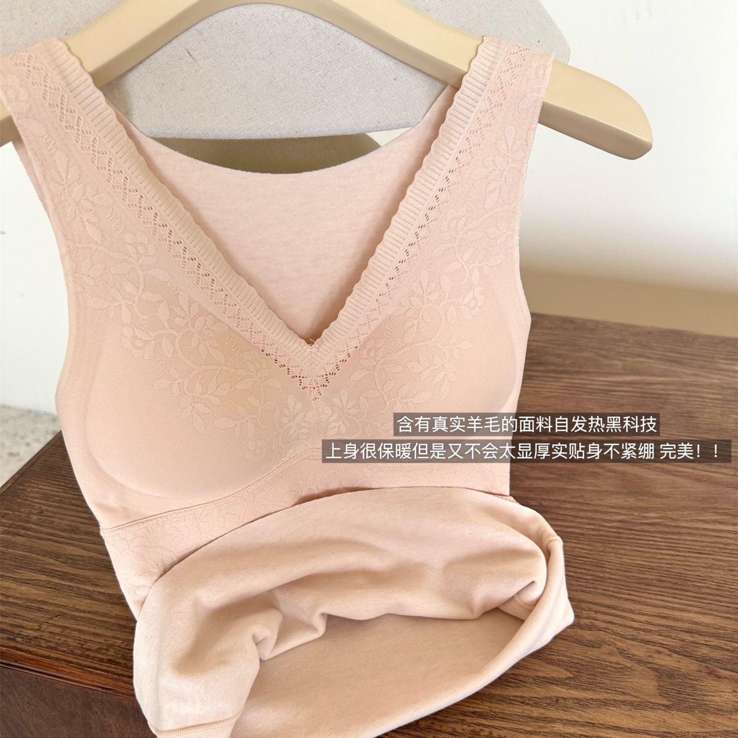 法式全蕾丝自发热羊毛保暖背心带胸垫内衣女长款内搭打底聚拢文胸