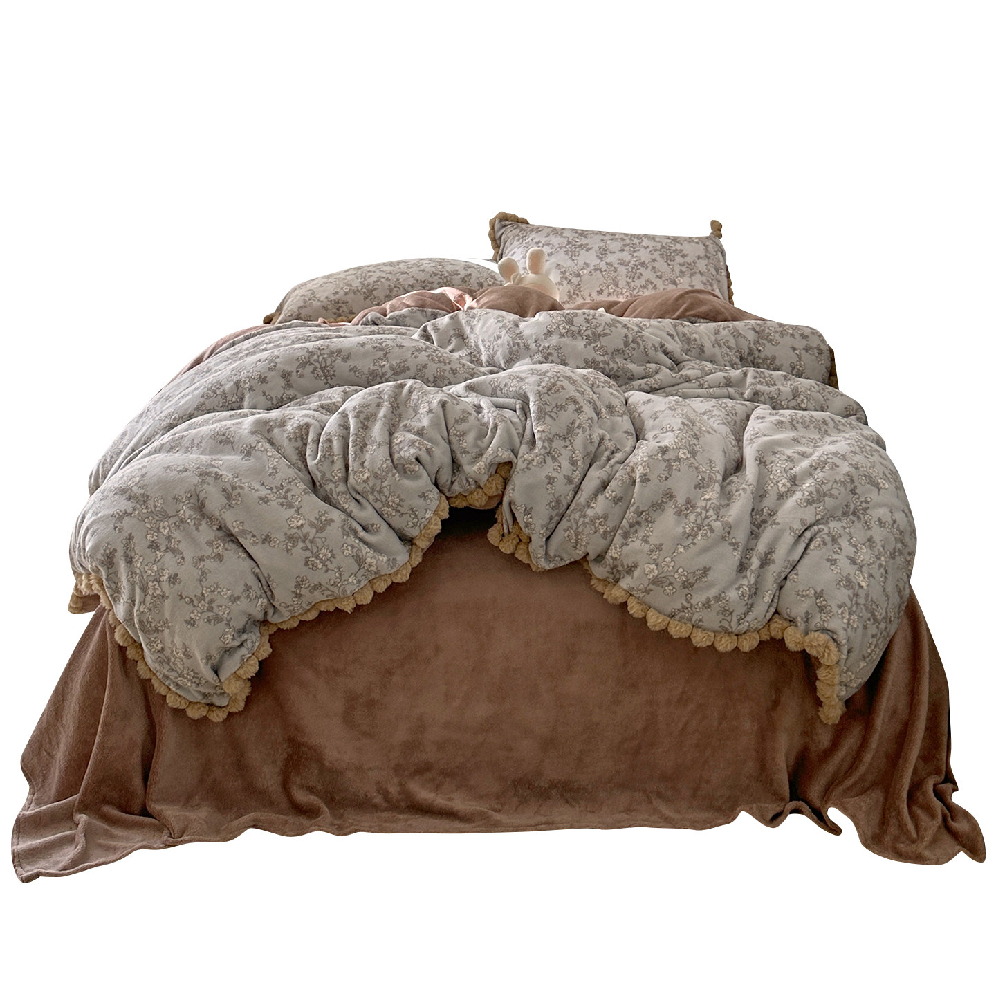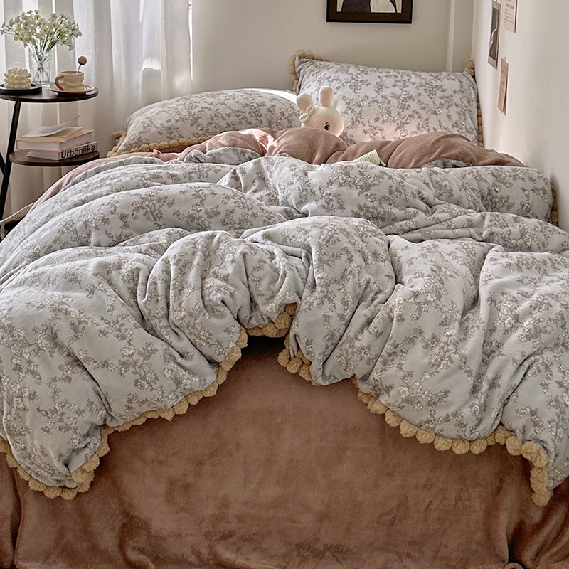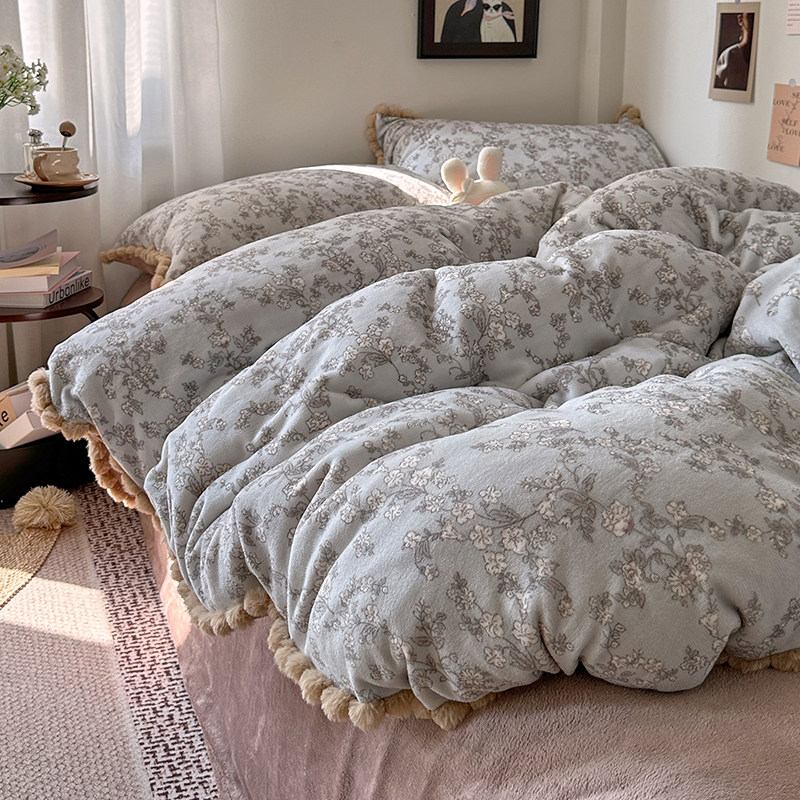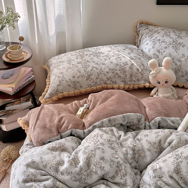 法式复古碎花毛球款牛奶绒四件套冬季加厚保暖珊瑚绒被套加绒床单