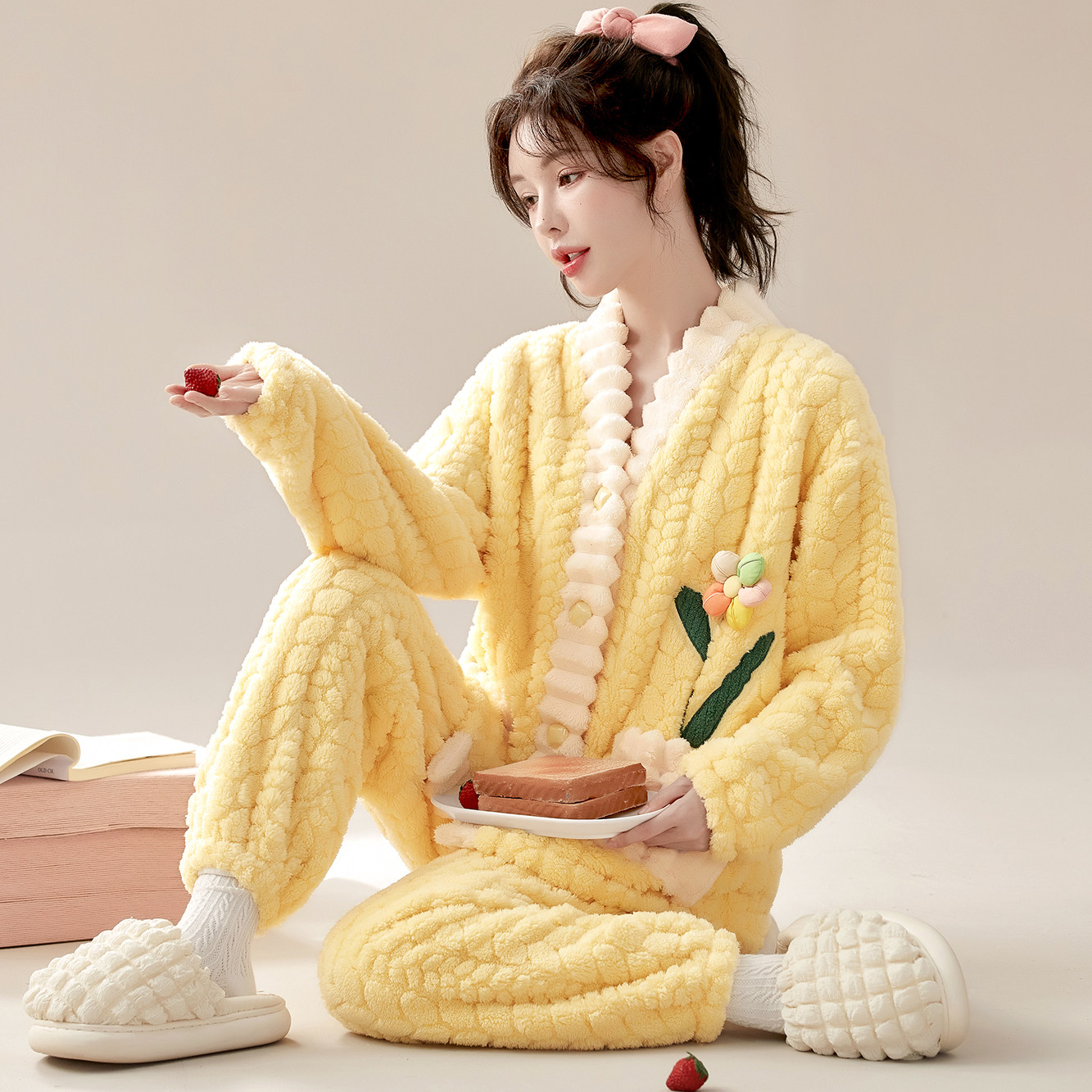 可外穿法兰绒睡衣女加绒加厚家居服V领珊瑚绒秋冬季甜美可爱大码
