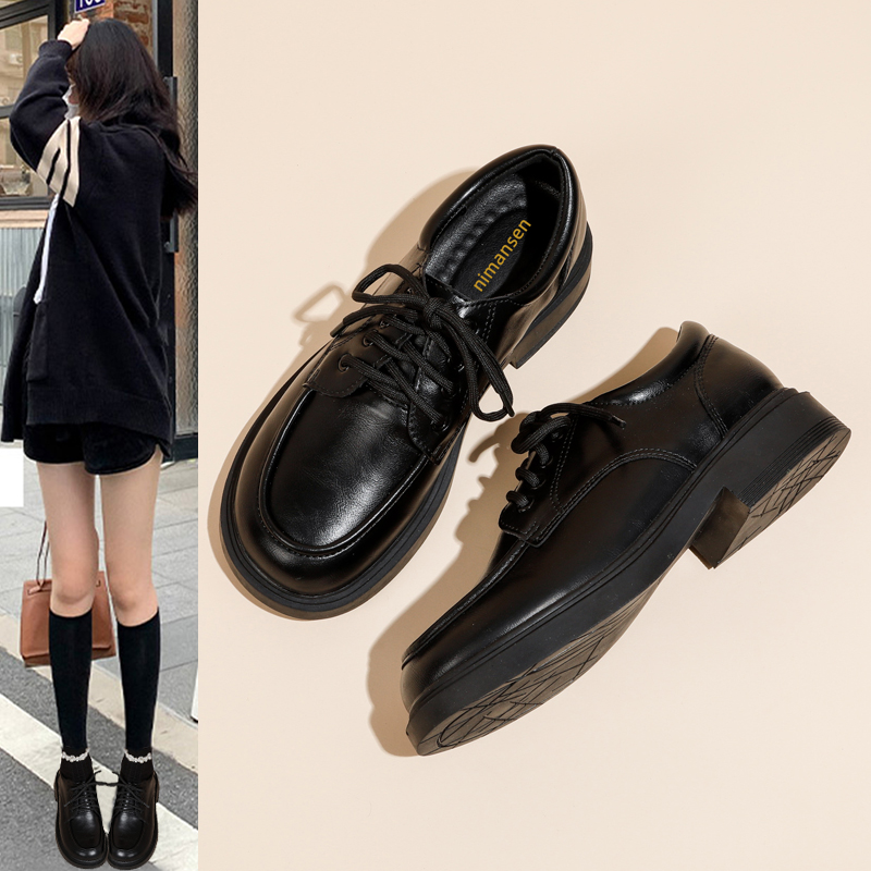 真皮乐福鞋女鞋子2025春秋百搭新款软底厚底系带黑小皮鞋休闲单鞋