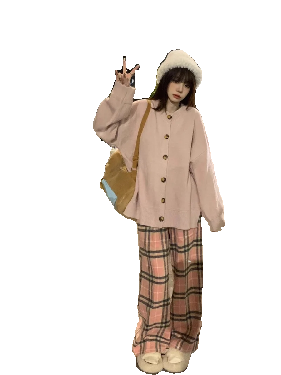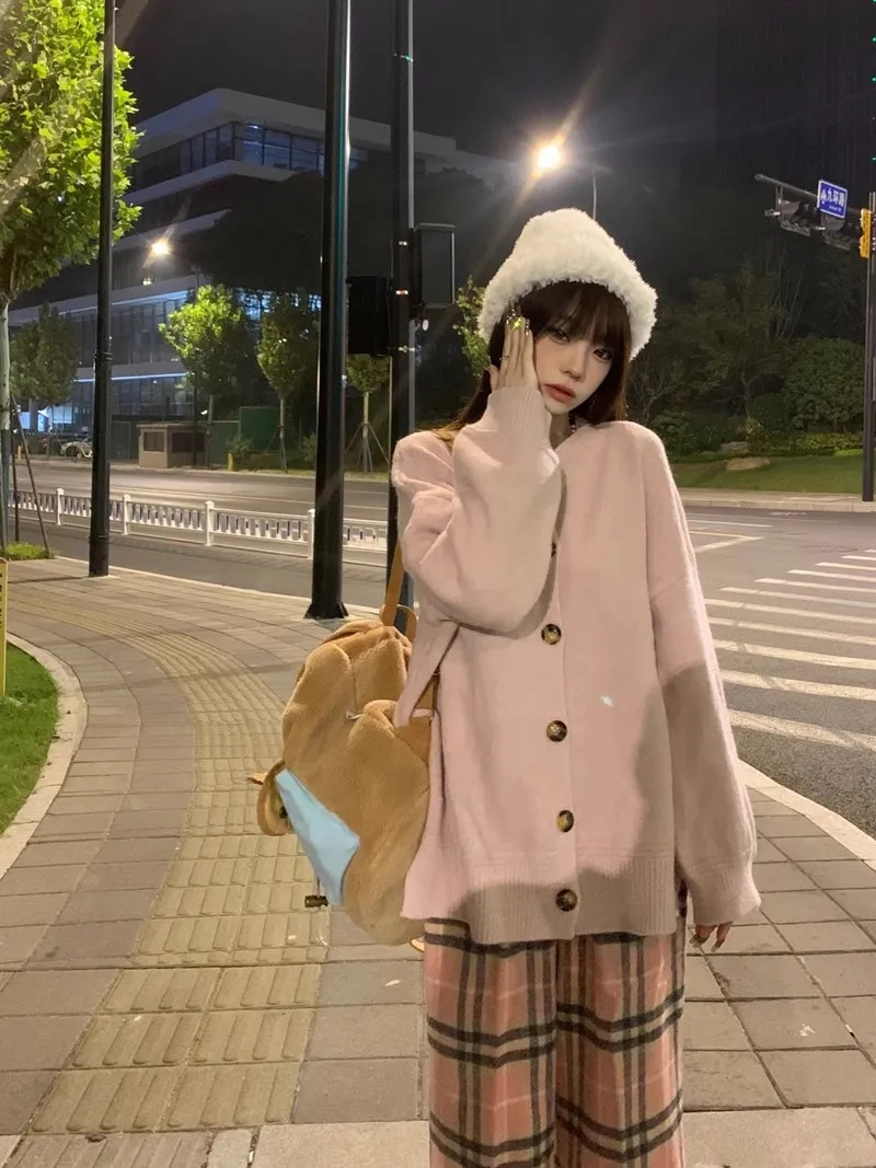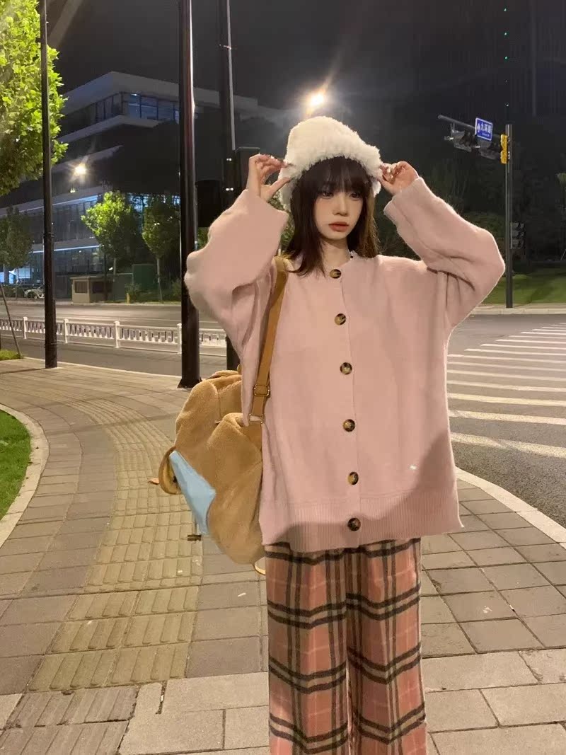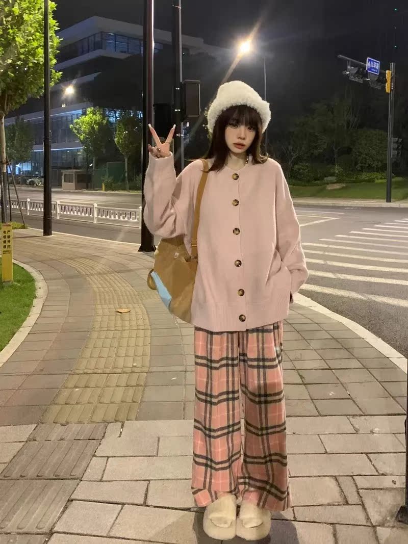 慵懒风韩系穿搭复古潮流针织开衫毛衣搭设计感格子阔腿裤两件套装