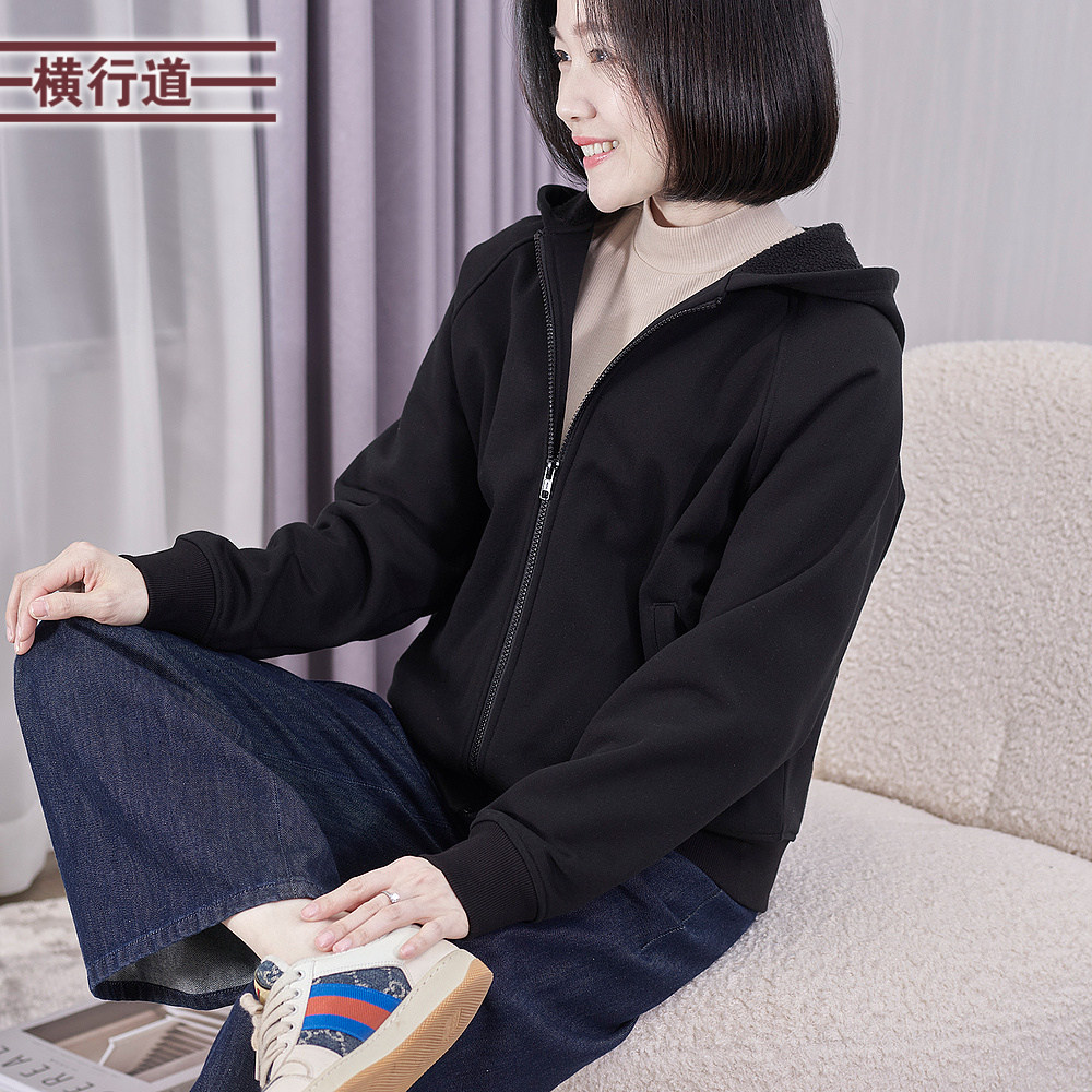 加绒加厚连帽卫衣拉链外套纯色黑色长袖冬装2025保暖女装新款