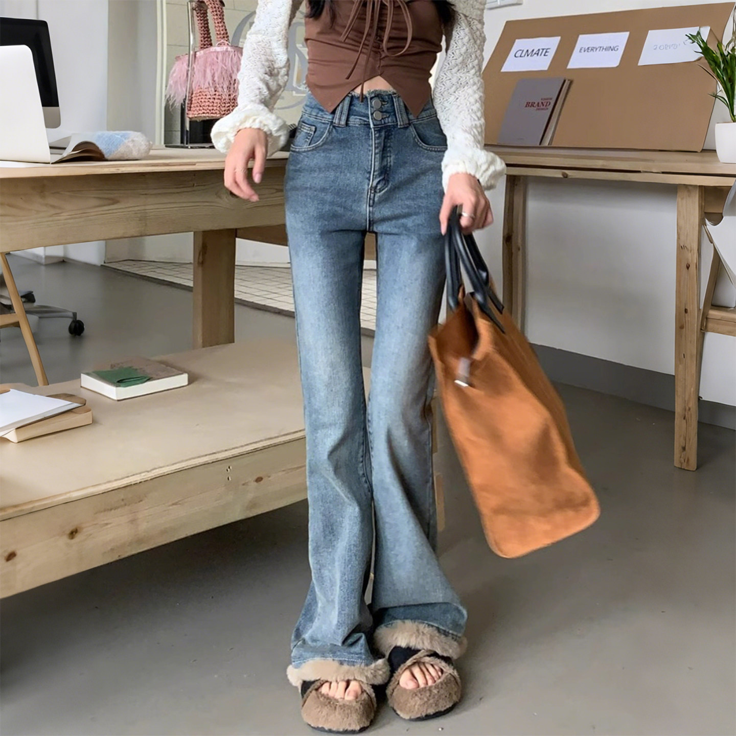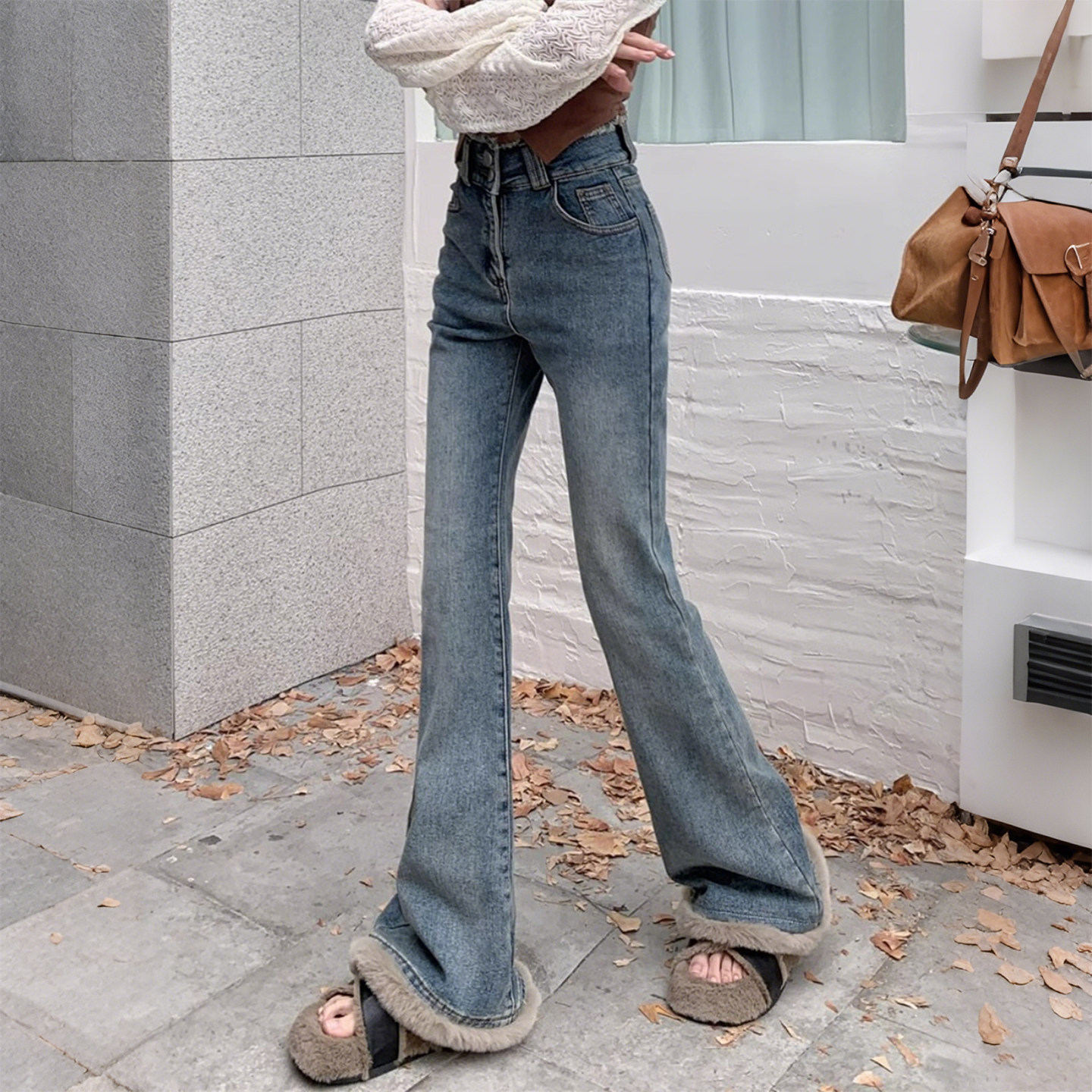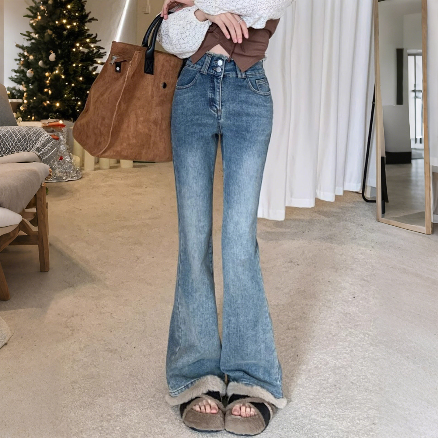 特大码女装胖mm复古加绒加厚微喇牛仔裤女高腰显瘦毛边喇叭马蹄裤