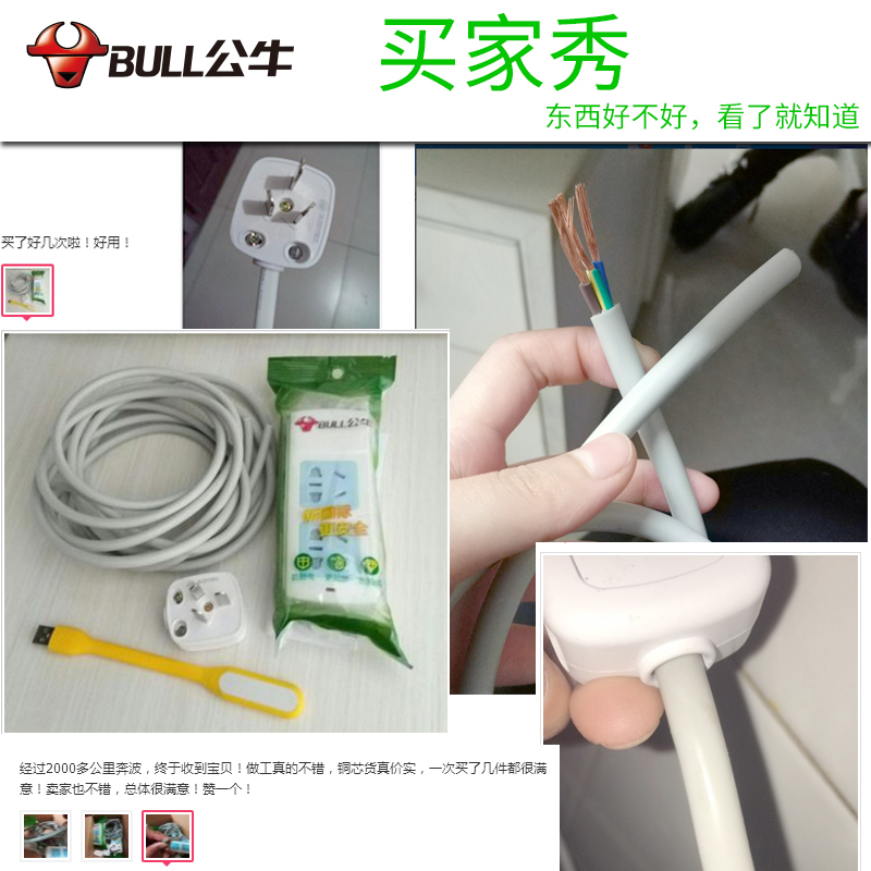 公牛护套电源线二2芯纯铜软线国标电线插头带线防水三3芯家用rvv