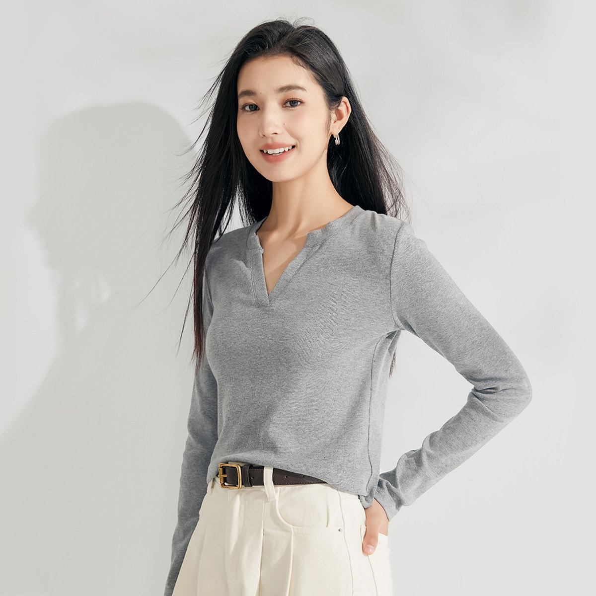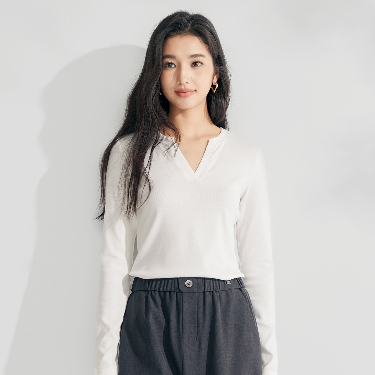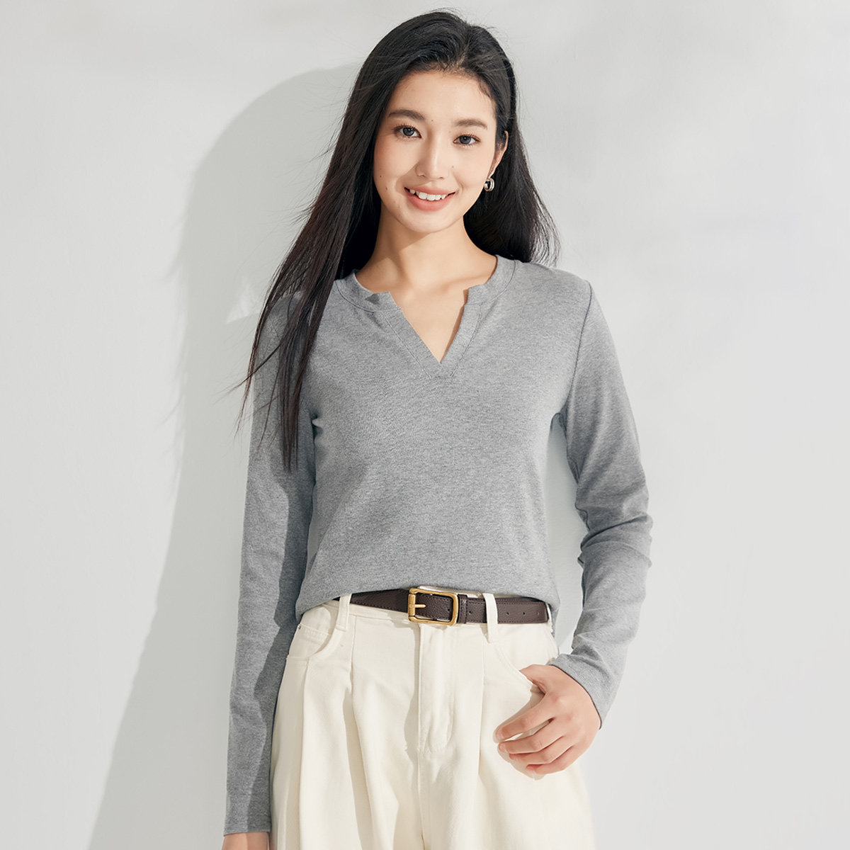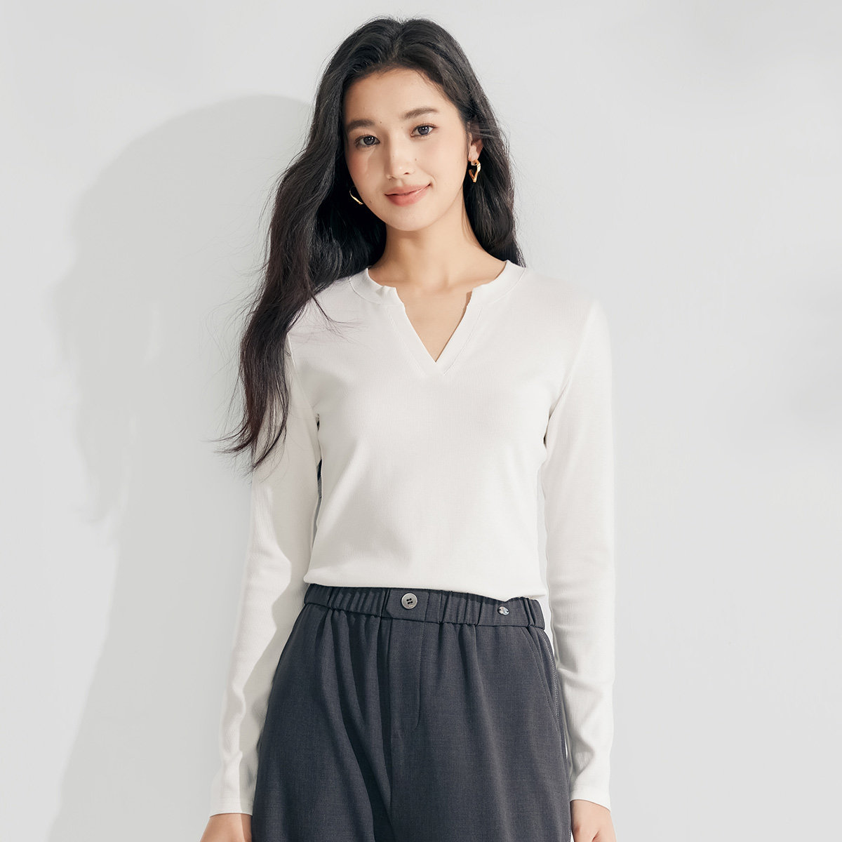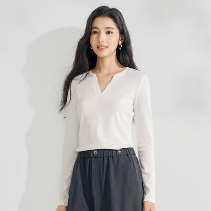 茵曼2026春季新款长袖t恤女显瘦正肩V领独特超好看爆款上衣白色
