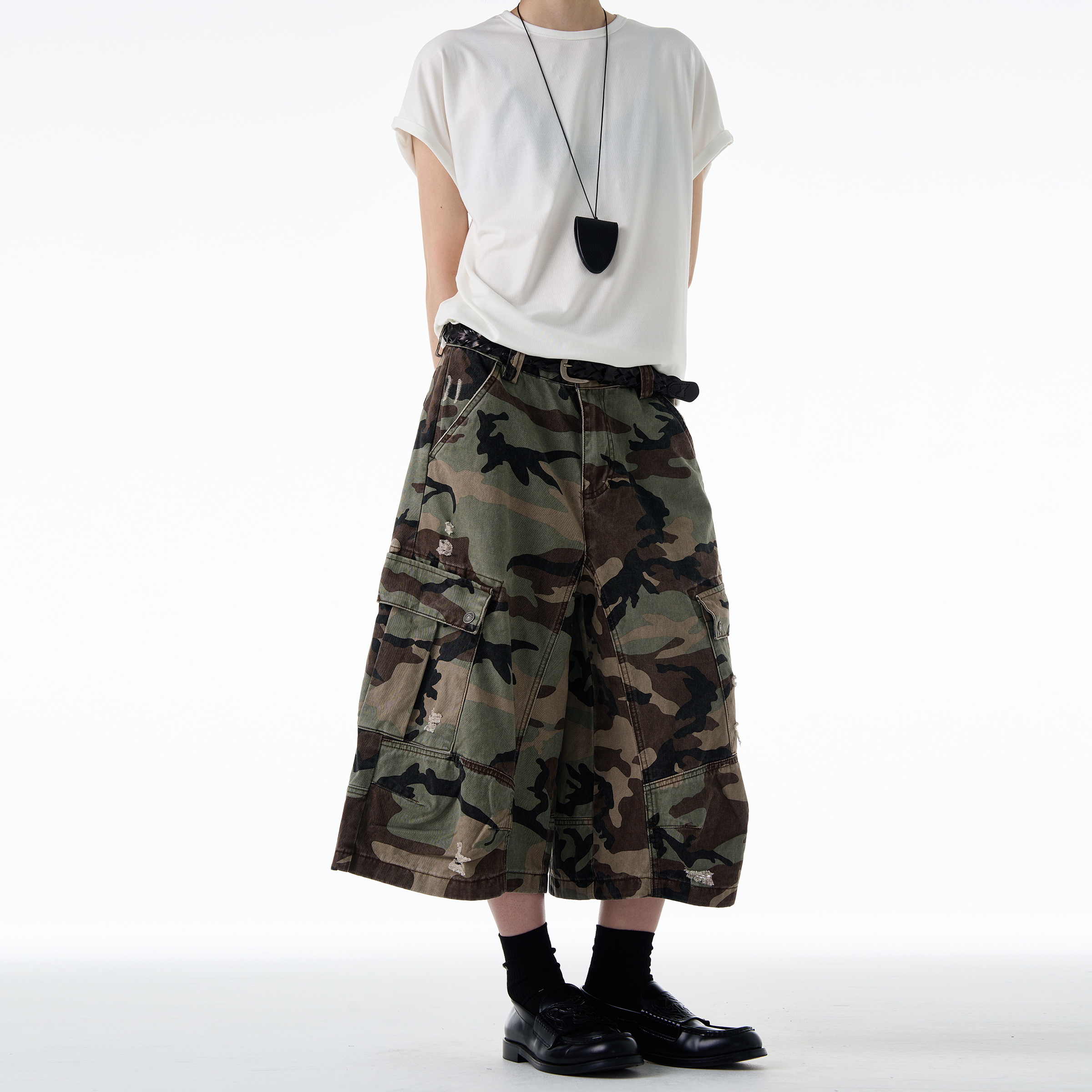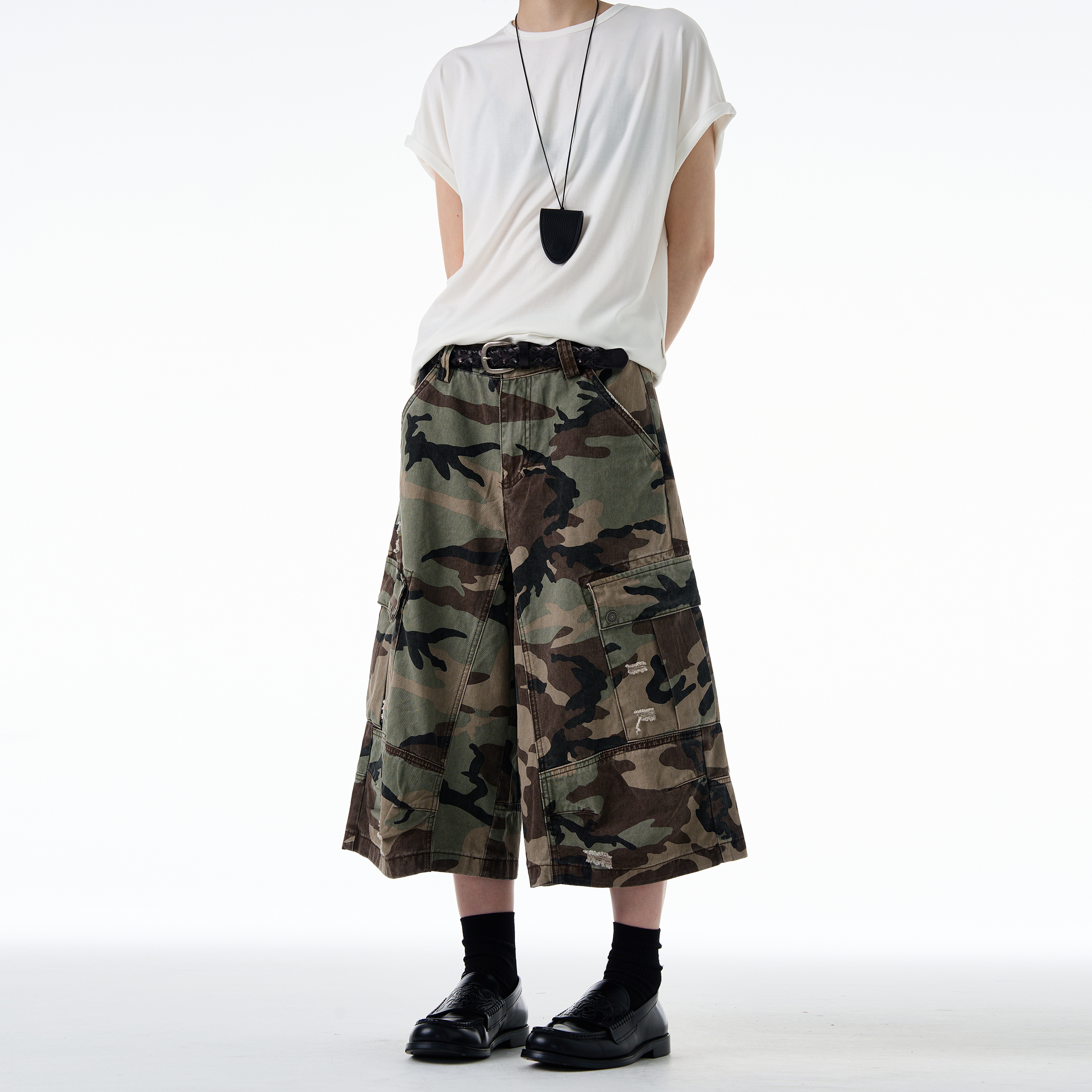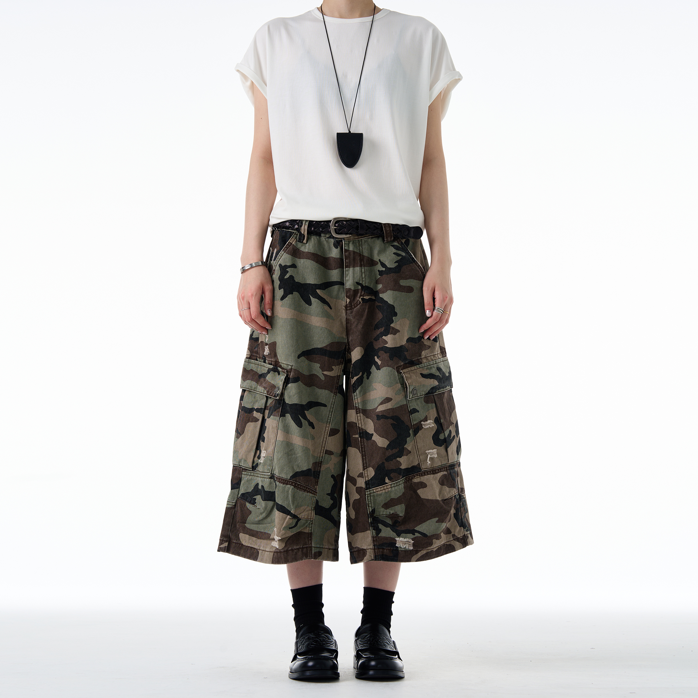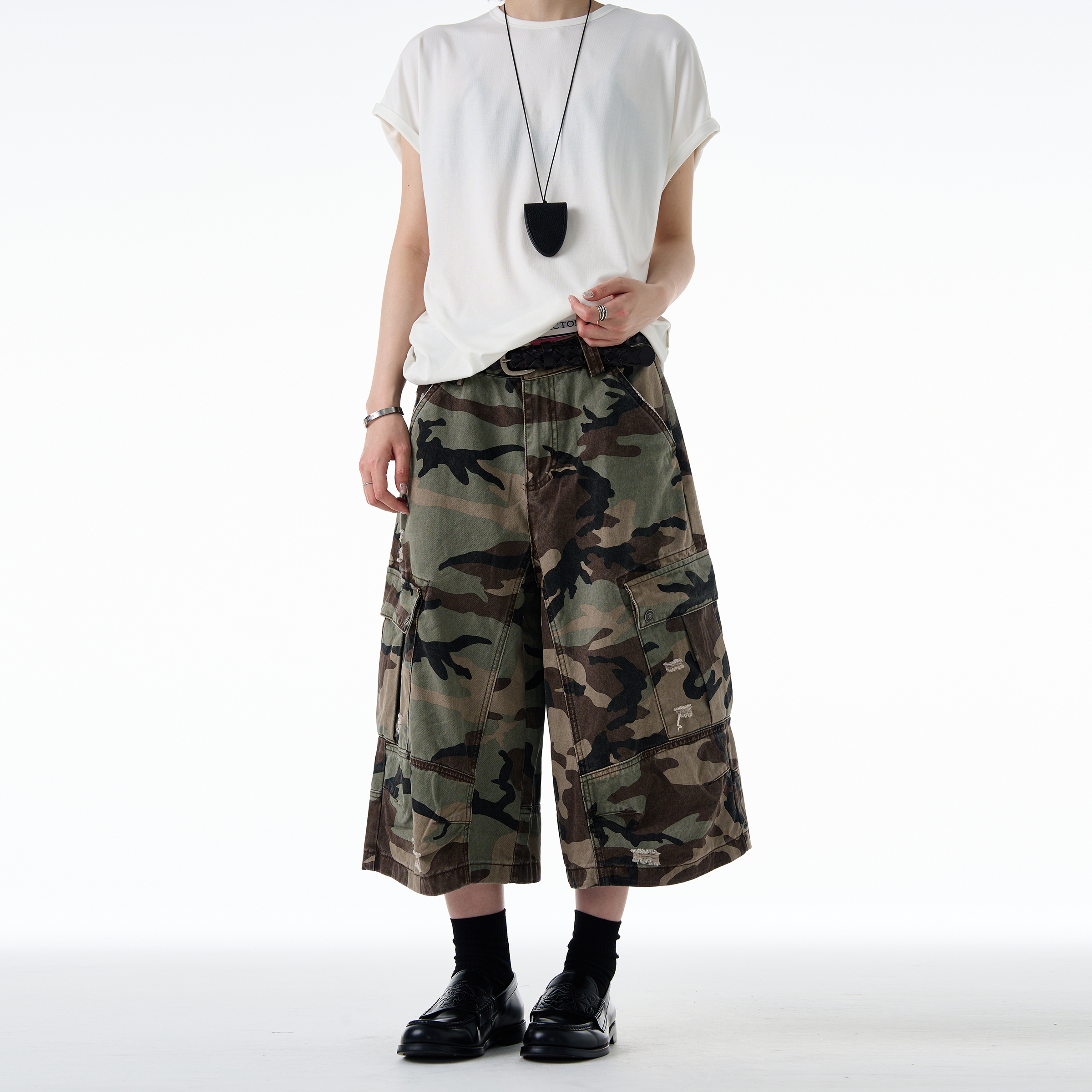 MADWITCH美式做旧磨破迷彩工装牛仔中裤男宽松阔腿vibe痞帅七分裤