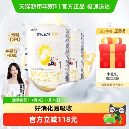 新国标荷兰进口佳贝艾特1段悦白婴儿配方羊奶粉400g*2罐OPL好吸收