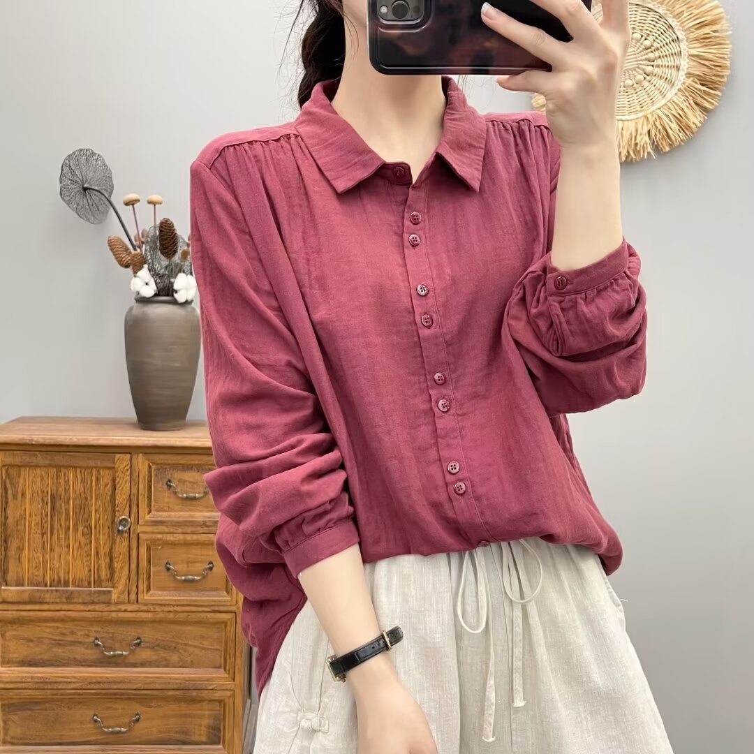 设计感双粒扣双层棉纱长袖衬衫女秋季纯色百搭婴儿棉打底衬衣6602