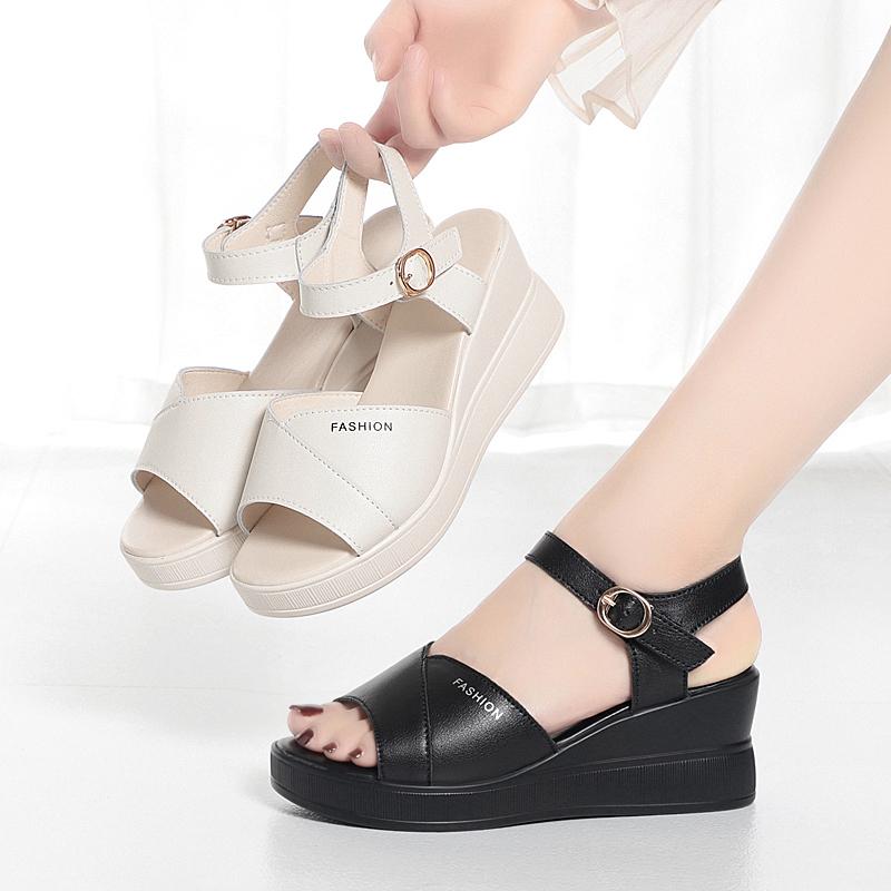 真皮松糕厚底坡跟凉鞋女外穿夏季增高女鞋舒适软底配裙子妈妈鞋子