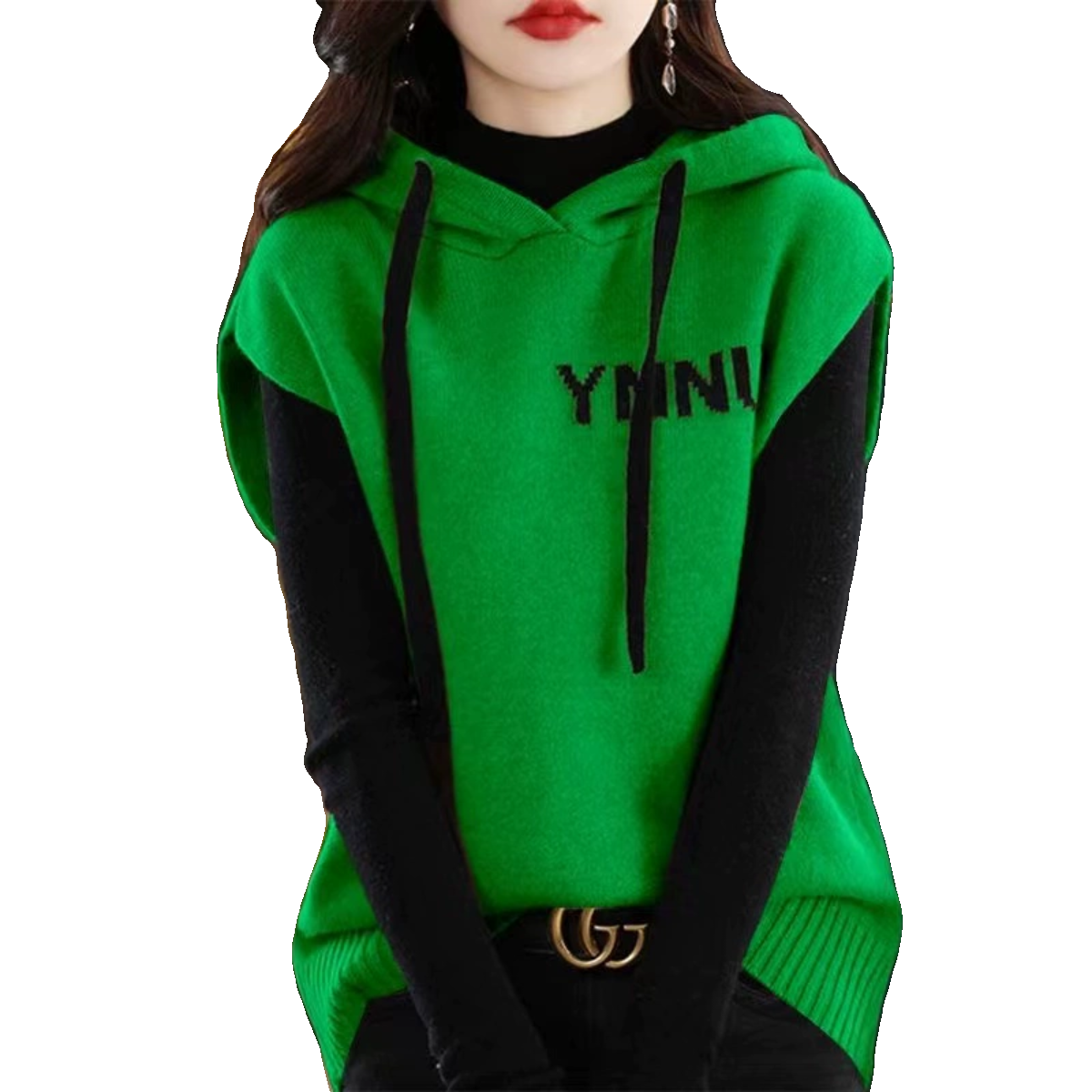 加肥加大码女装连帽无袖针织马甲背心女秋冬宽松显瘦洋气针织外套