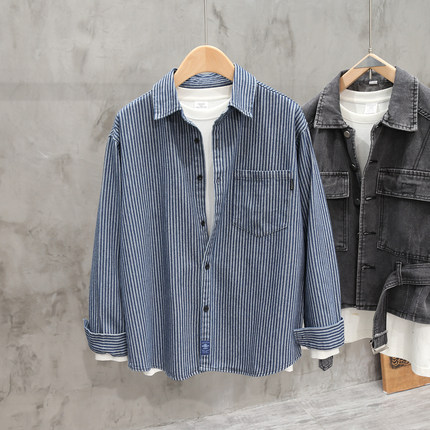 美式复古竖条纹长袖牛仔衬衫男