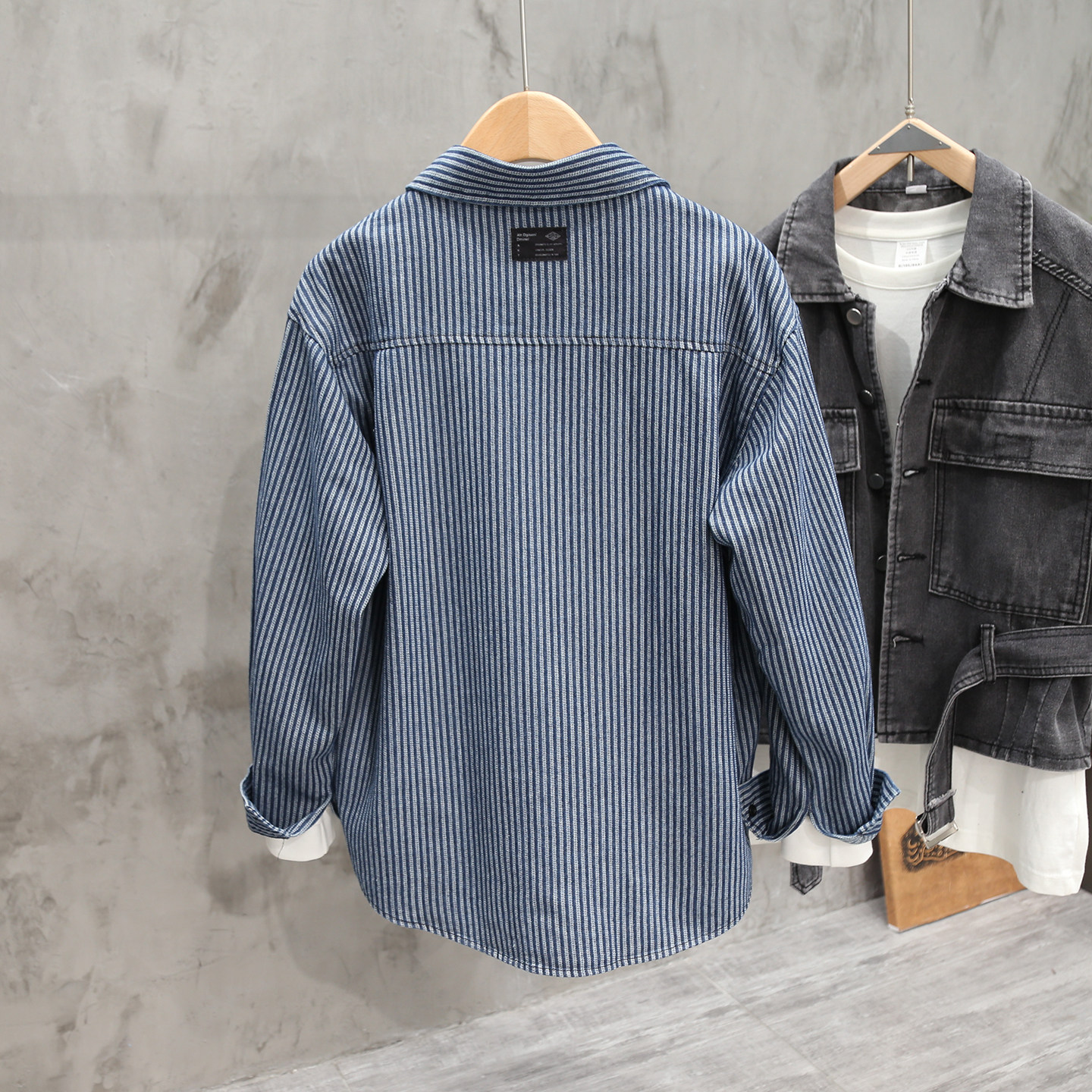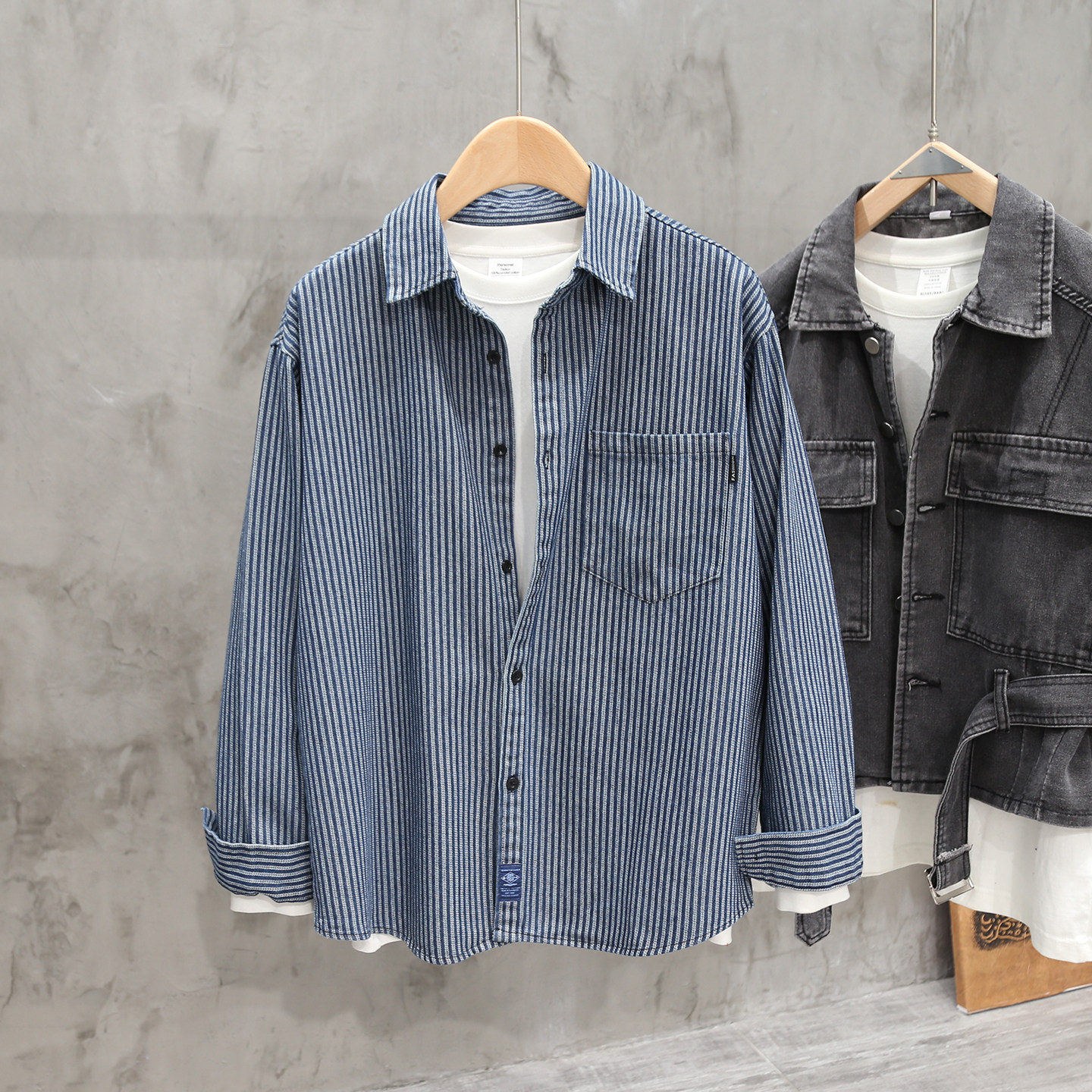 美式复古竖条纹色织口袋长袖牛仔衬衫男士休闲潮牌春秋季衬衣外套