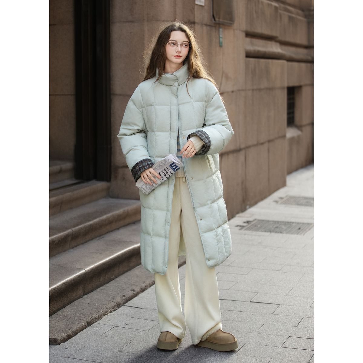 唐狮2025冬季长款羽绒服女立领拼接格纹设计过膝保暖羽绒外套鸭绒