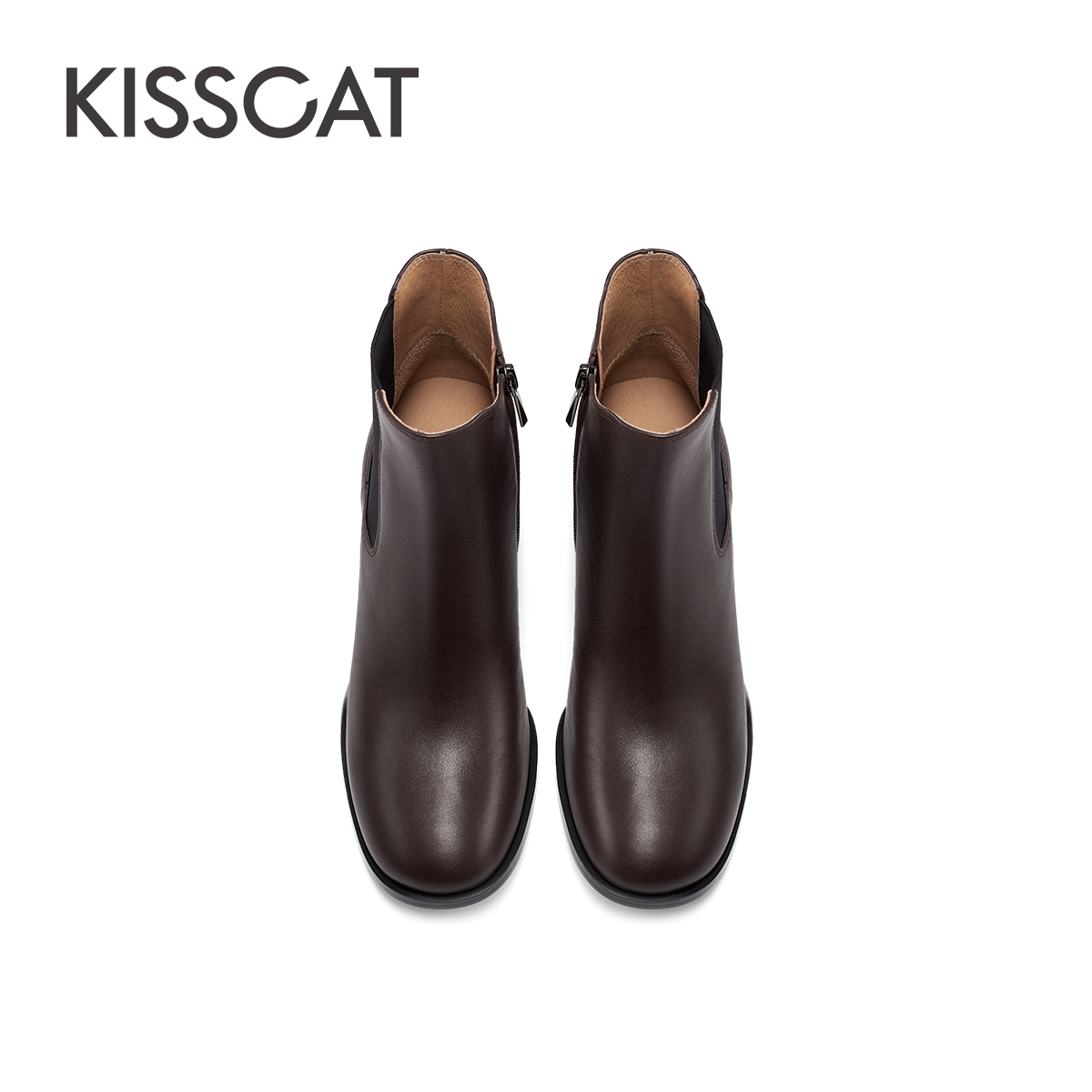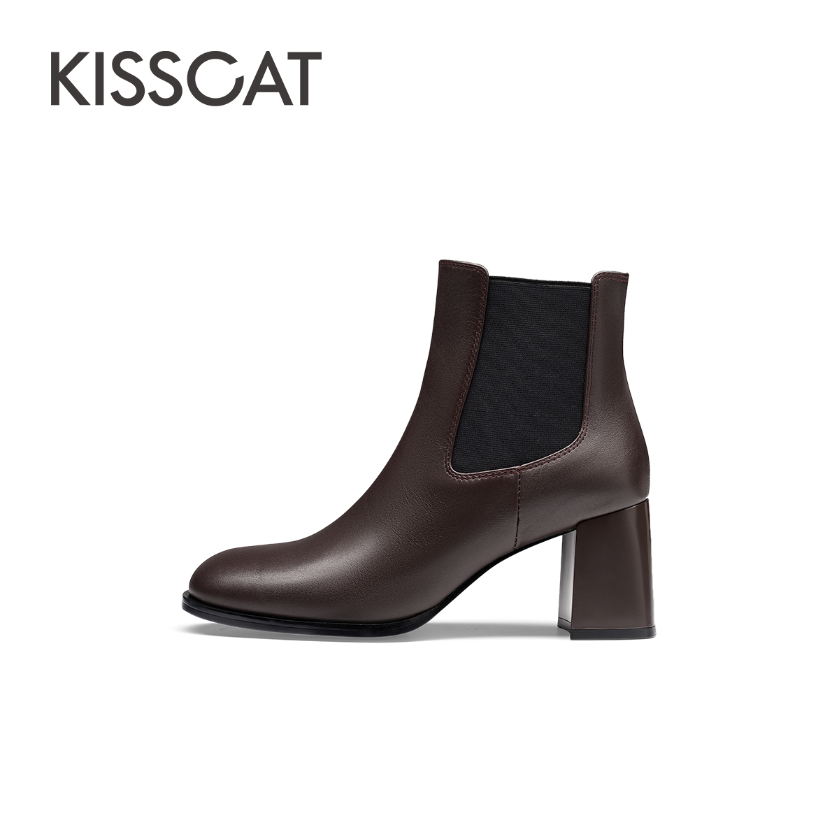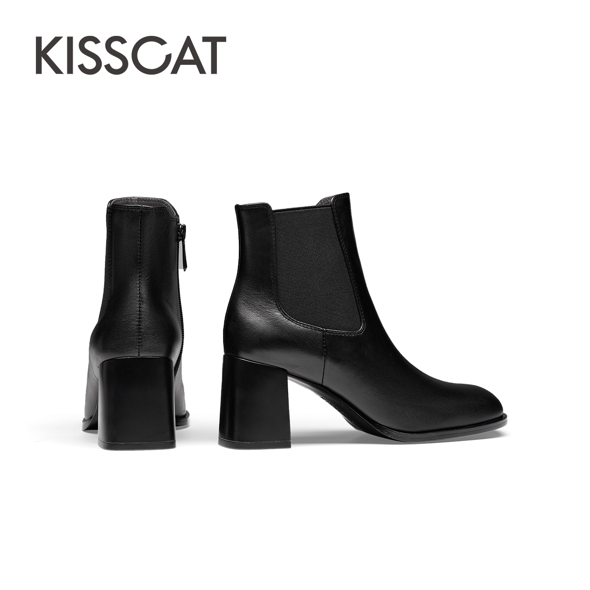 KISSCAT接吻猫秋季新款粗跟切尔西靴女真皮短靴通勤高跟靴时装靴